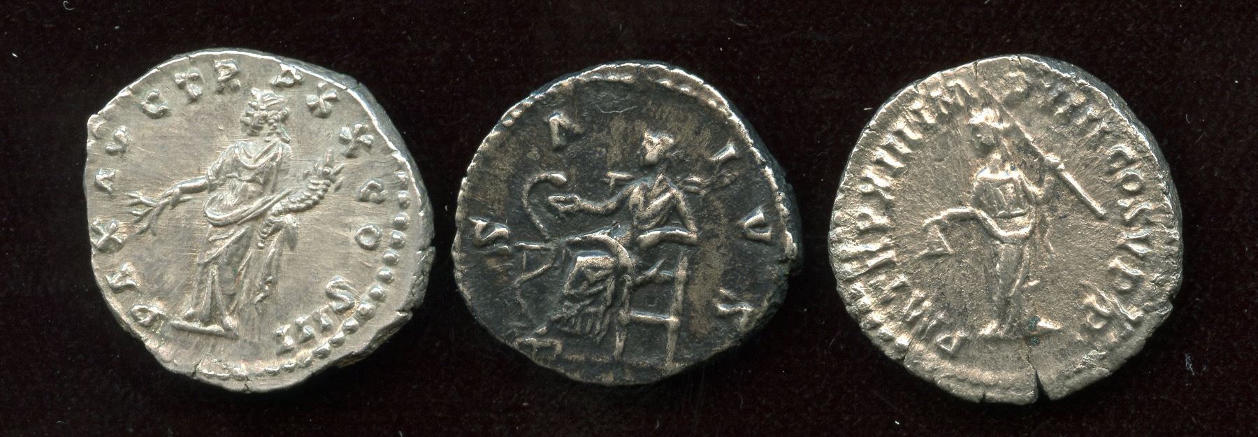 Marcus Aurelius (3.37g) Rev: Pax stg. l. RIC 146; gVF/aEF || Faustina Jr. (2.85g) Rev: Salus standing. l. RIC 714; VF, toned || Commodus (2.85g) Rev: Libertas stg. with pileus and sceptre. RIC 168; gVF, flan crack.