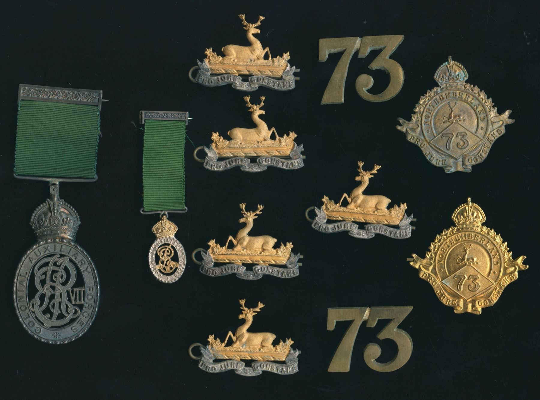 An outstanding Colonial Auxiliary Forces awarded to Lieutenant Colonel J.D.B.F. MacKenzie of Chatham, NB. He not only did he receive the medal but was an early member of the American Numismatic Association, number 43. He commanded the 73rd Northumberland New Brunswick Battalion of Infantry formed in 1870 in Chatham. The Battalion was later amalgamated into the North Shore Regiment. Included in this lot are his Officer's Decoration, the miniature of the same medal, 8 pieces of the 73rd that should be viewed. A truly wonderful lot. 11 Pcs.