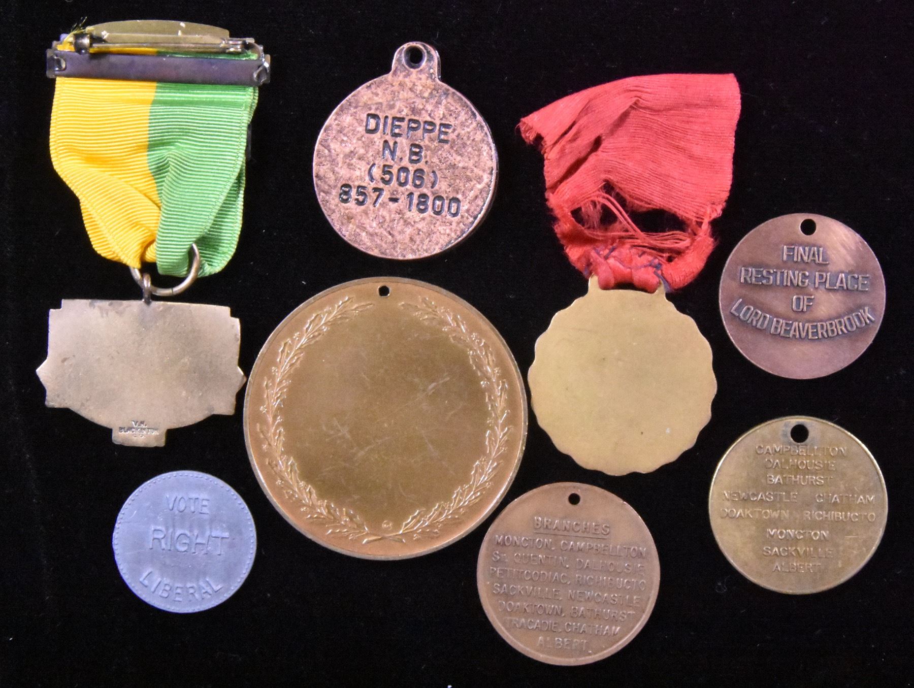 Town of Newcastle, Final Resting Place of Lord Beaverbrook; Lounsbury Co. advertising 75th Anniversary, bronze for Campbellton and a second piece for Moncton; Dan Riley white metal political specimen, Saint John Liberal; Champlain Nisson, Dieppe, NB, advertising copper medal; Outstanding Achievement Award, St. Andrews, NB, bronze; Canadian Brotherhood of Railway Employees, bronze, red ribbon, Moncton, NB; New Brunswick Rifle Association, Service Team, 1947, bronze. Lot of 8 pcs.