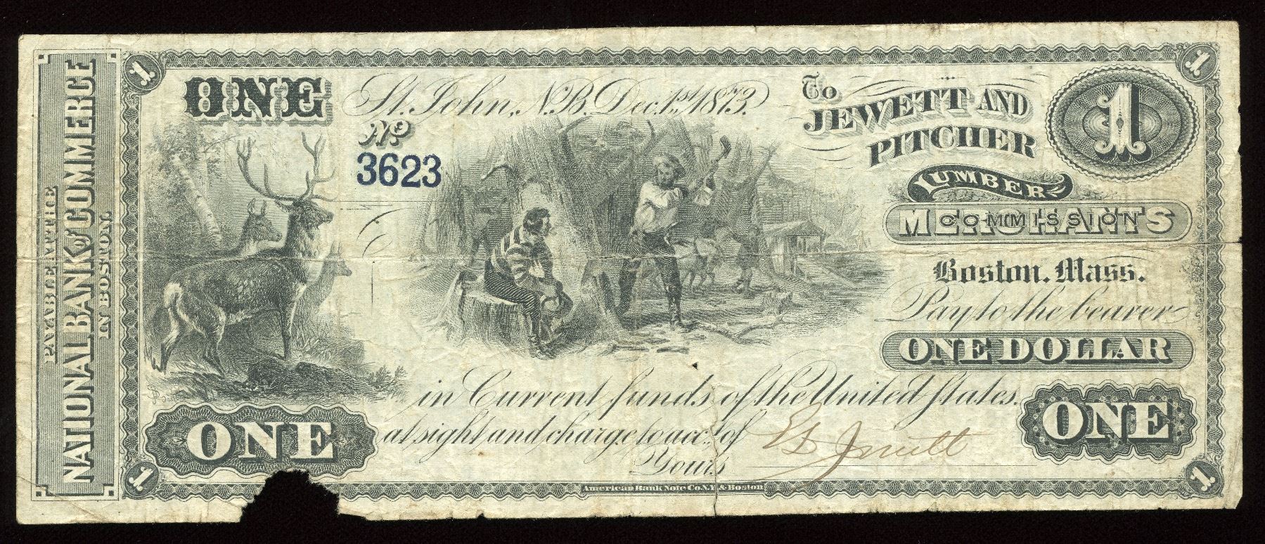 CH NB 15-12-02-02, $1.00, Lumber Merchants, VF with 1 inch tear at bottom and chunk out of the bottom. S/N:2743.