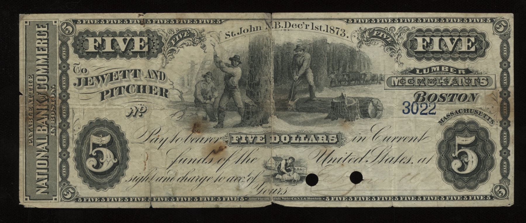 New Brunswick Scrip, Jewett and Pitcher $5, 1873