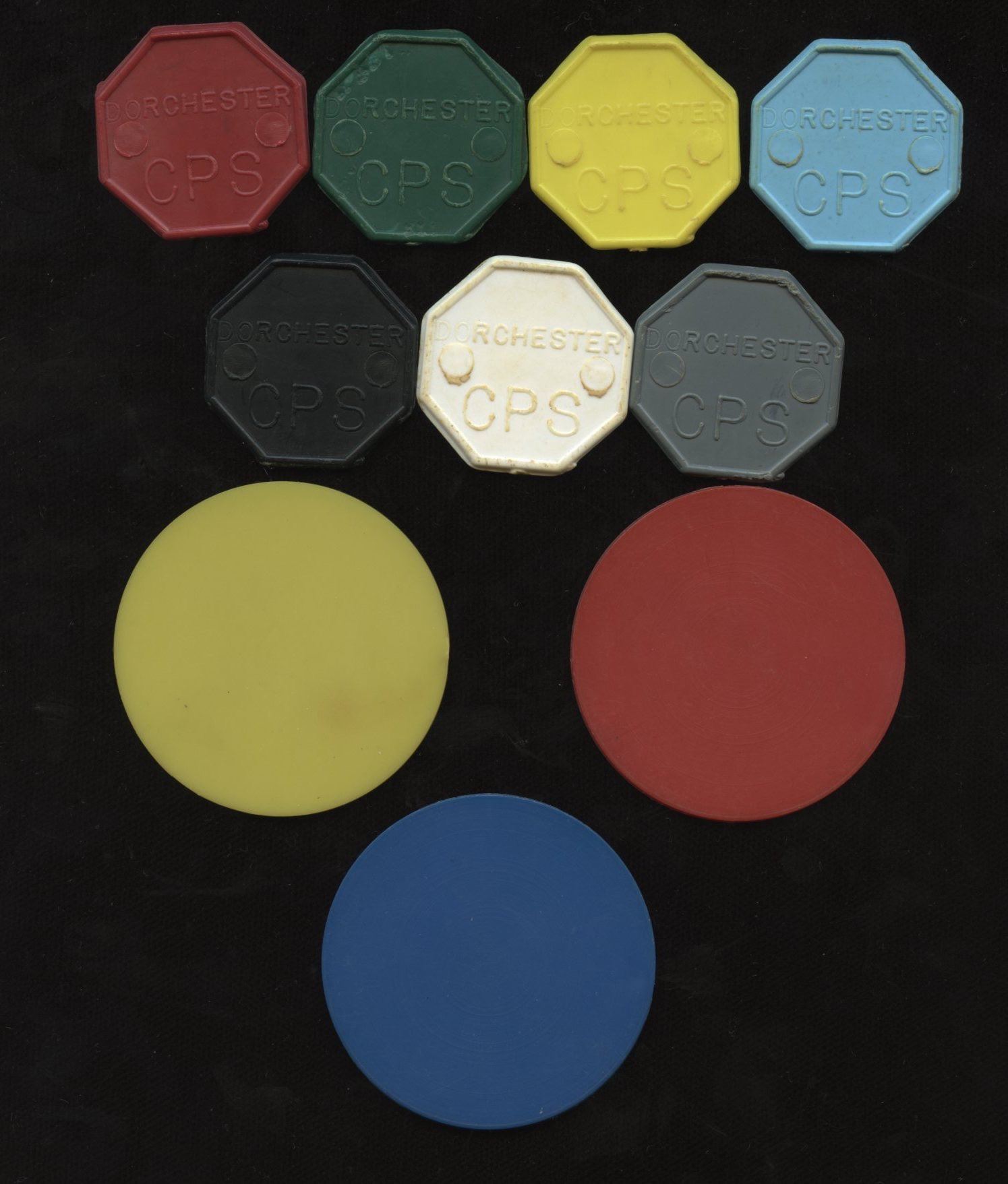 Prison tokens used at Dorchester Penitentiary in Dorchester, NB. There are 3 original plastic specimens with nothing printed on them. They were the first tokens ever used for this use. There are 7 pieces printed with the denomination on the reverse and Dorchester/CPS on the obverse. 5, 10, 25, 1.00, 2.00, 5.00 and 10.00 included. 10 Pcs.