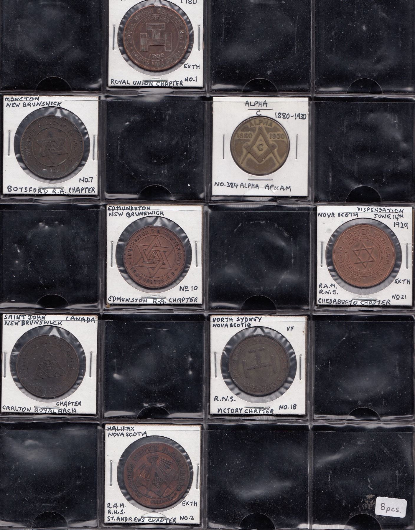 Botsford, Moncton; Edmunston; Carlton, Saint John; No. 384 Alpha; Chebucto; North Sydney; St. Andrews, Halifax; Royal Union, Halifax. 8 Pcs.