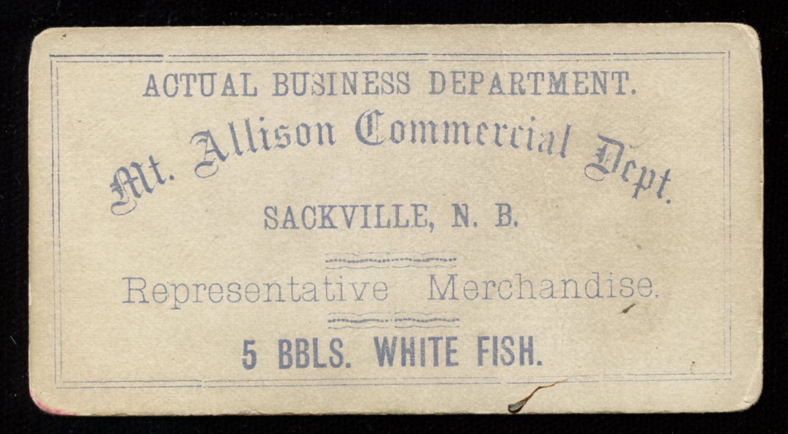 Mount Allison Business College, Sackville, NB, 5 BBLS. White Fish, Students figuring on reverse. This cataloguer has never seen these before.