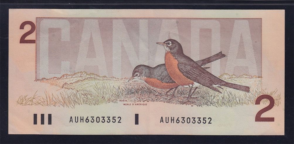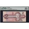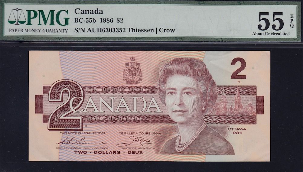 New Discovery 1986 Bank of Canada $2 RARE AUH Thiessen - Crow Finest Known - PMG AU55 EPQ, totally original note in almost uncirculated condition. This is the finest known of the five found. Excessively rare note. No other note of this quality has been sold for this prefix and signature combination. S/N:AUH6303352.