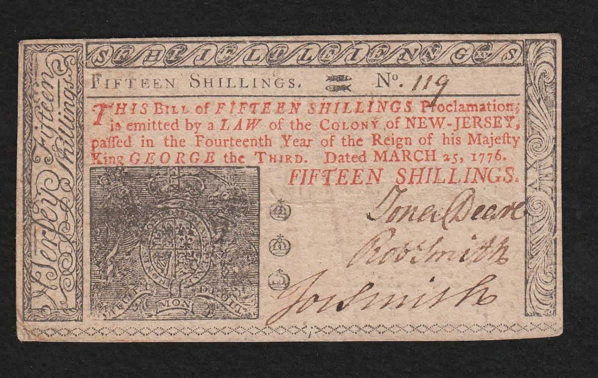 New Jersey. March 25, 1776. Fifteen Shillings.