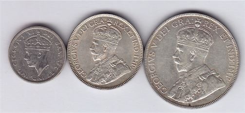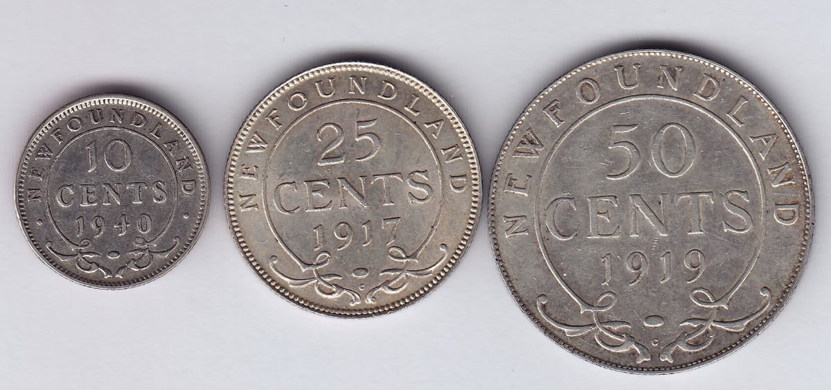 Includes: 1940 Ten Cents, VF. 1917 Twenty Five Cents, AU. 1919 Fifty Cents, VF. 3 Pcs.