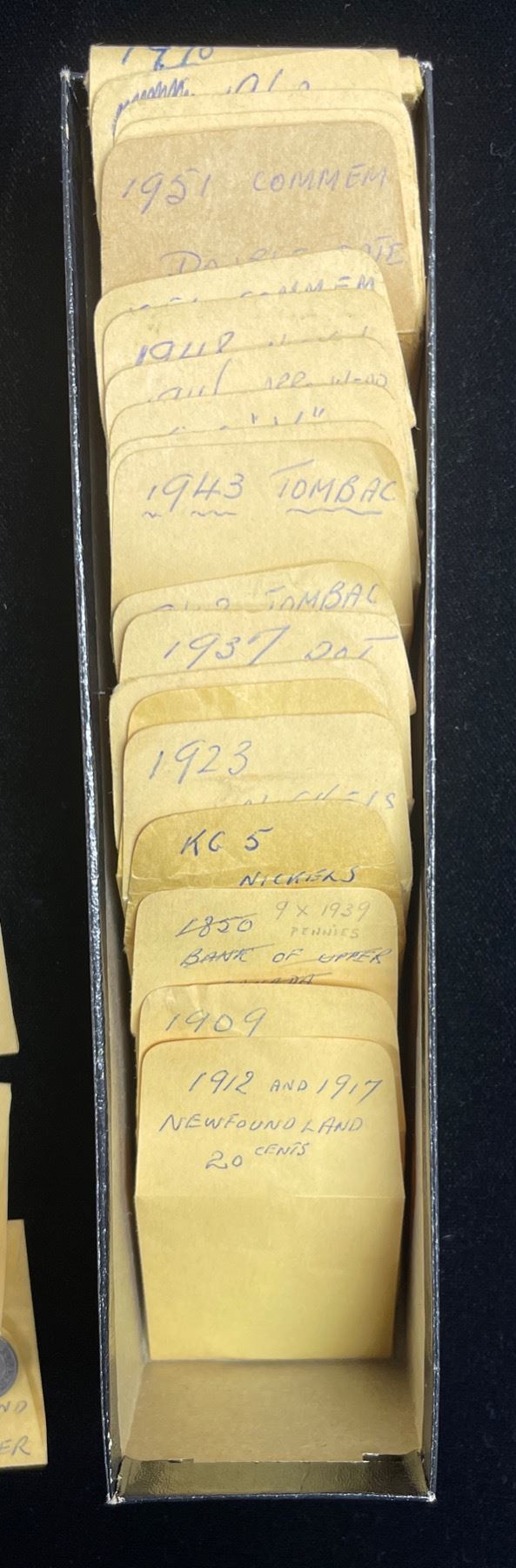 New arrival of Newfoundland 1 pennies, 5 cent silver, 10 cents silver, 20 cent silver, 50 cents silver along with an assortment of Canadian 1 & 5 Cents all housed in a 2x2 box.