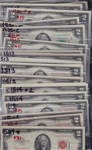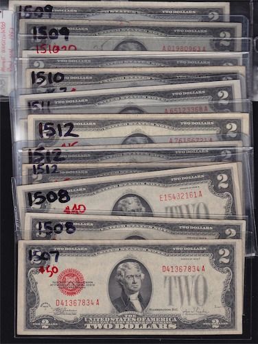 Nice Dealer Bulk Lot of USA $2 Banknotes - Lot includes: 10x 1928 Issue Red Seal; 10x 1953 Issue Red Seal; 2x 1953* Replacement Red Seal; 16x 1963 Red Seal; 1976 Issue; 3x 1995 Issue; 2x 1995* Replacements; 4x 2003 Issue; 2003* Replacement Issue. Well over $800 retail at catalogue prices. 49 Pcs.