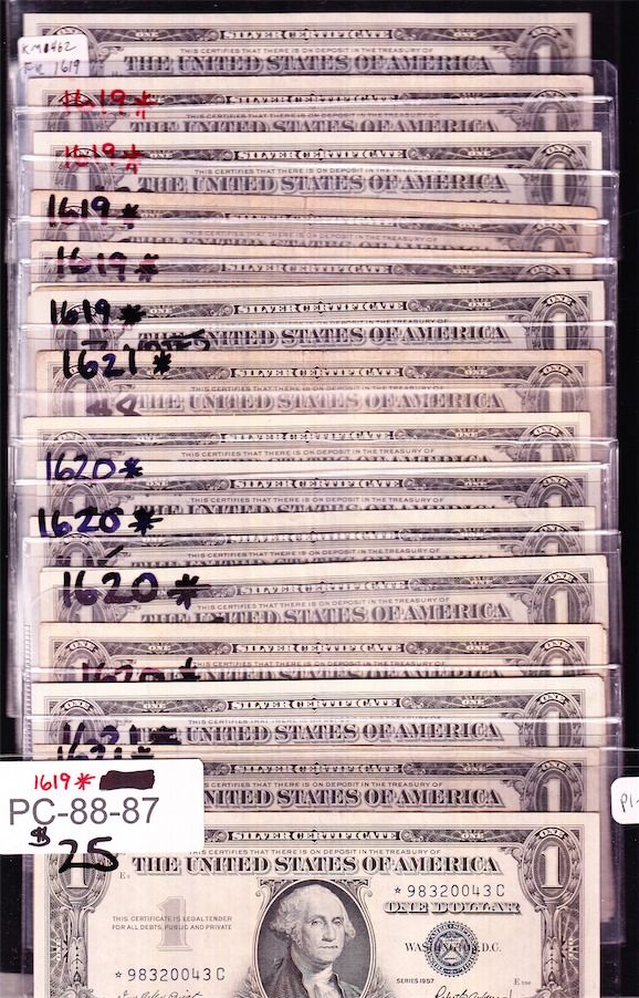 Nice lot of 31 1957* Silver Certificates - All $1.00 notes of 1957, 1957A, 1957B Series. FR 1619*, 1620*, 1621*, mixed districts and conditions but with a few consecutive Unc's included. 31 Pcs.