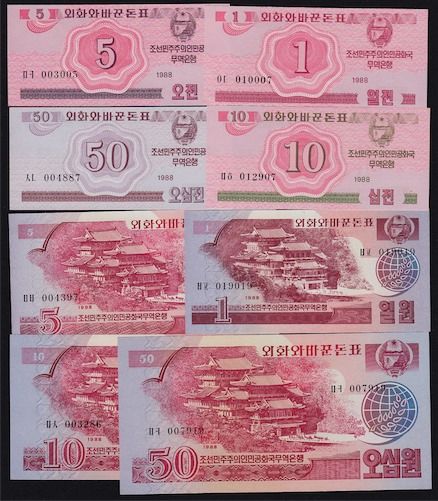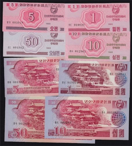 North Korea - 1 Chon - 50 Won 1988 P-31 to 38, "Socialist visitor issue", two Original UNC sets, catalogue value $200. 16 Pcs.