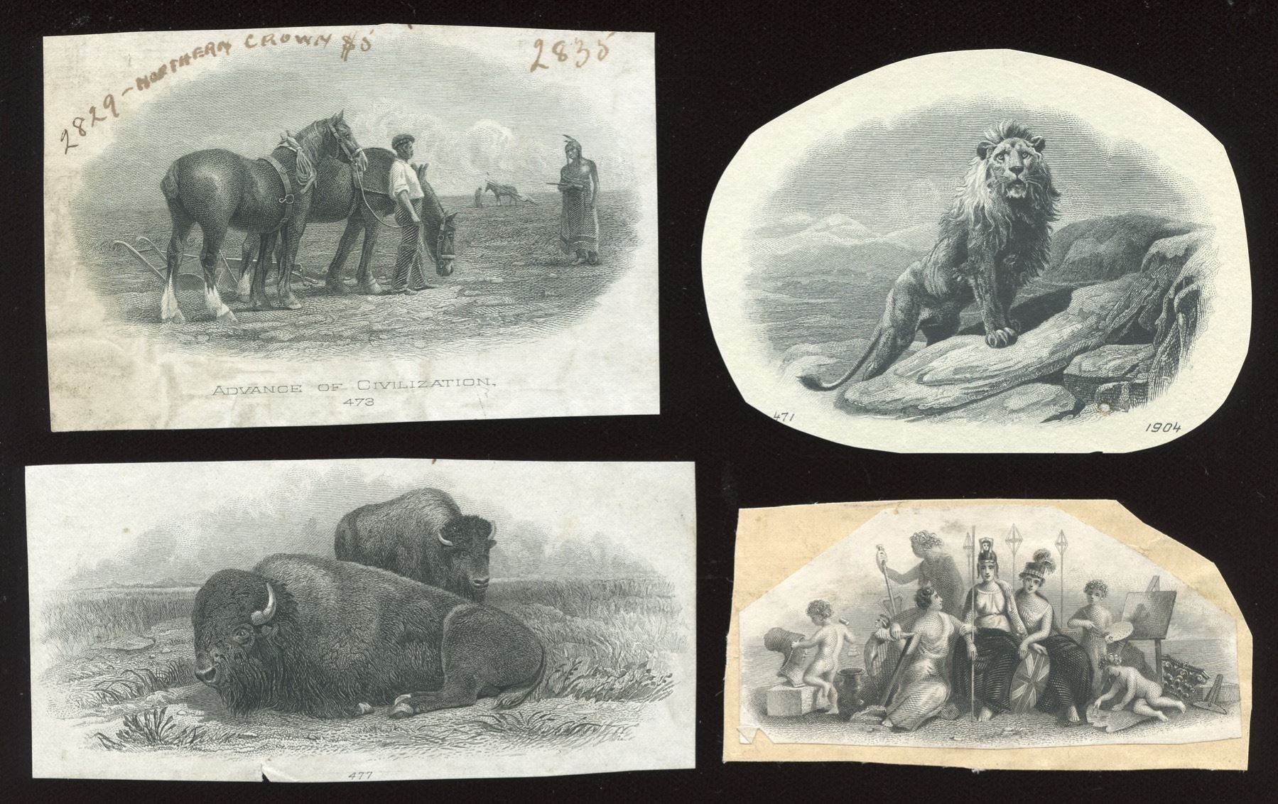 Northern Bank/Northern Crown Bank, "Advance of Civilization" on $5, writing and a bit soiled; bison on $20; lion on Northern Crown $50. Also Bank of New Brunswick, Britannia group found on most of its notes, cut down. Four die proof vignettes.
