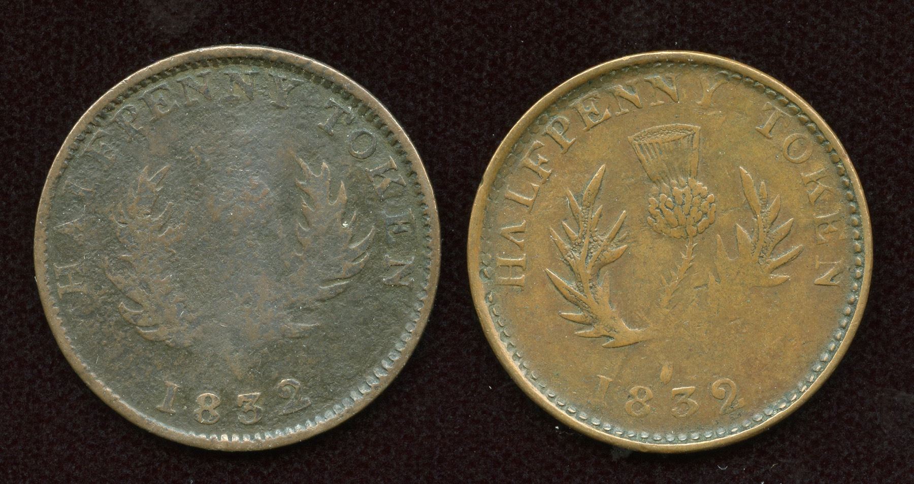 Co. 277 and 283.CH NS-3A1. F, but pitted. CH 3D2, F+. Both types under-rated: outside of Co. 280 they are the two scarcest of the counterfeit halfpennies known to Courteau. 2 Pcs.