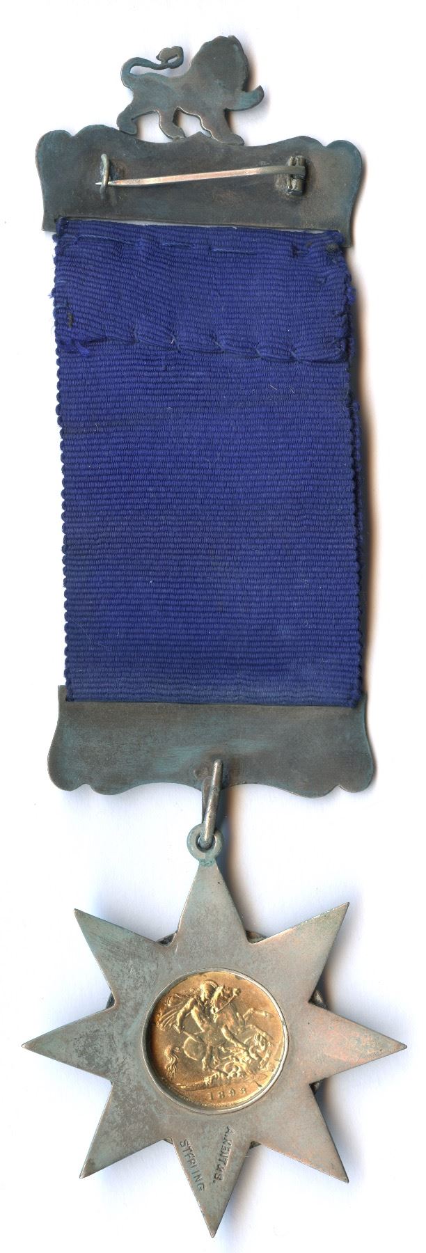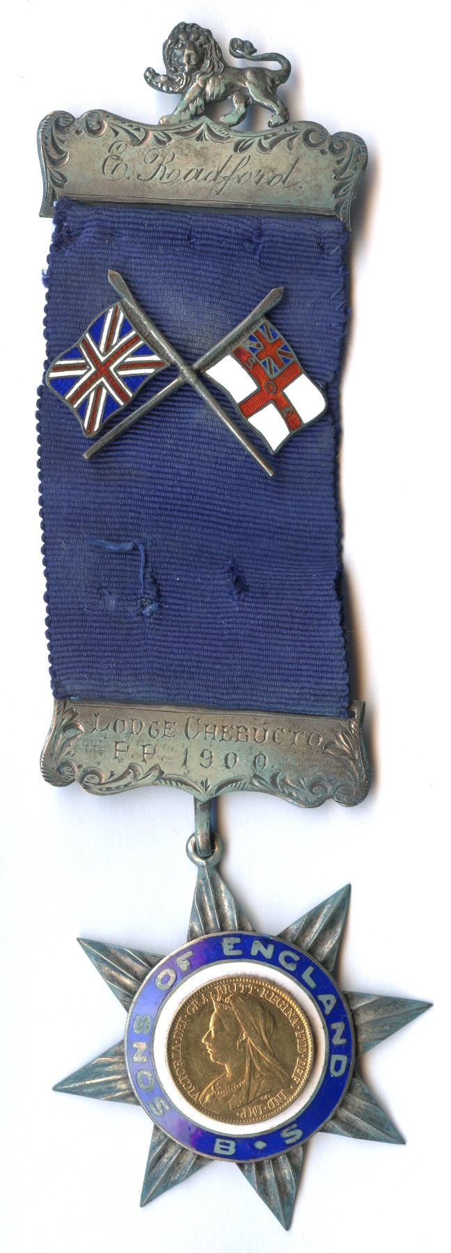 A gold British half sovereign encased in a silver star shaped , enamelled blue with Sons of England, a blue ribbon attached with 2 small enamel flags of England and the sons of England. A silver bar states Lodge Chebucto/ P.P. 1900 A nicely designed and attractive specimen given to E. Radford.