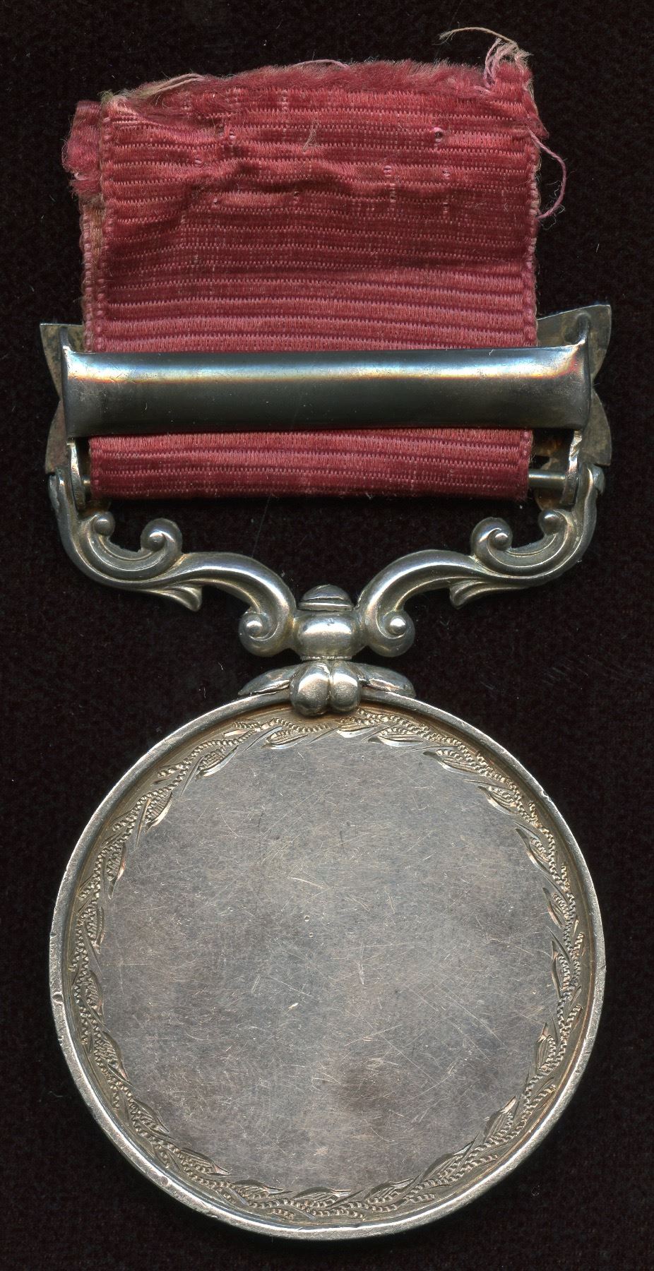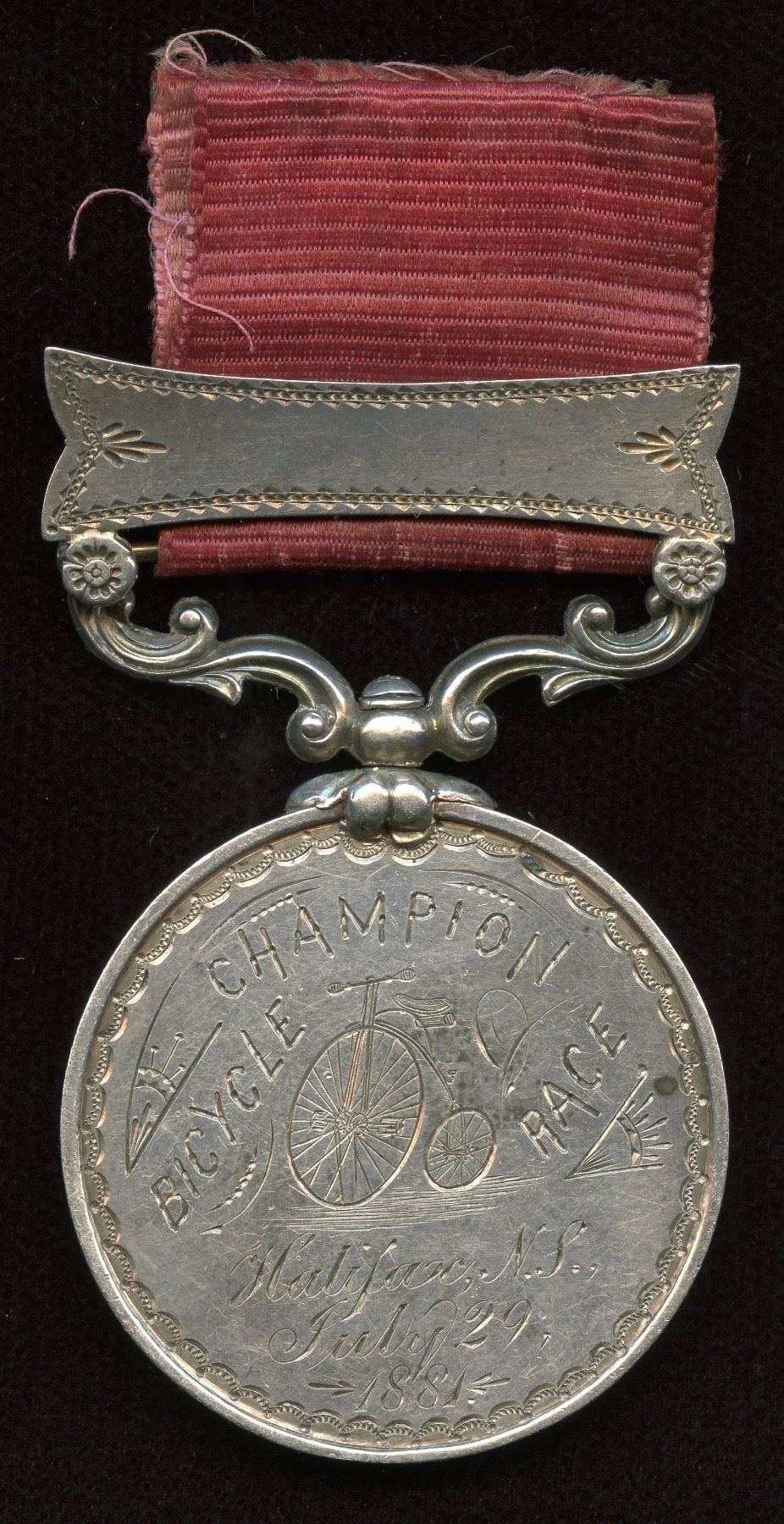 Silver 35 mm with suspender. Hand engraved "CHAMPION BICYCLE RACE/ Halifax N. S. / July 29, /1881" above and below a " Penny- Farthing bicycle " Reverse plain. Won by John Stairs with copy from The Morning Herald, Saturday July 30, 1881, Vol VII No.179, EF with original red ribband. Rare and early for a Canadian cycling medal. Ex:Tim Henderson.