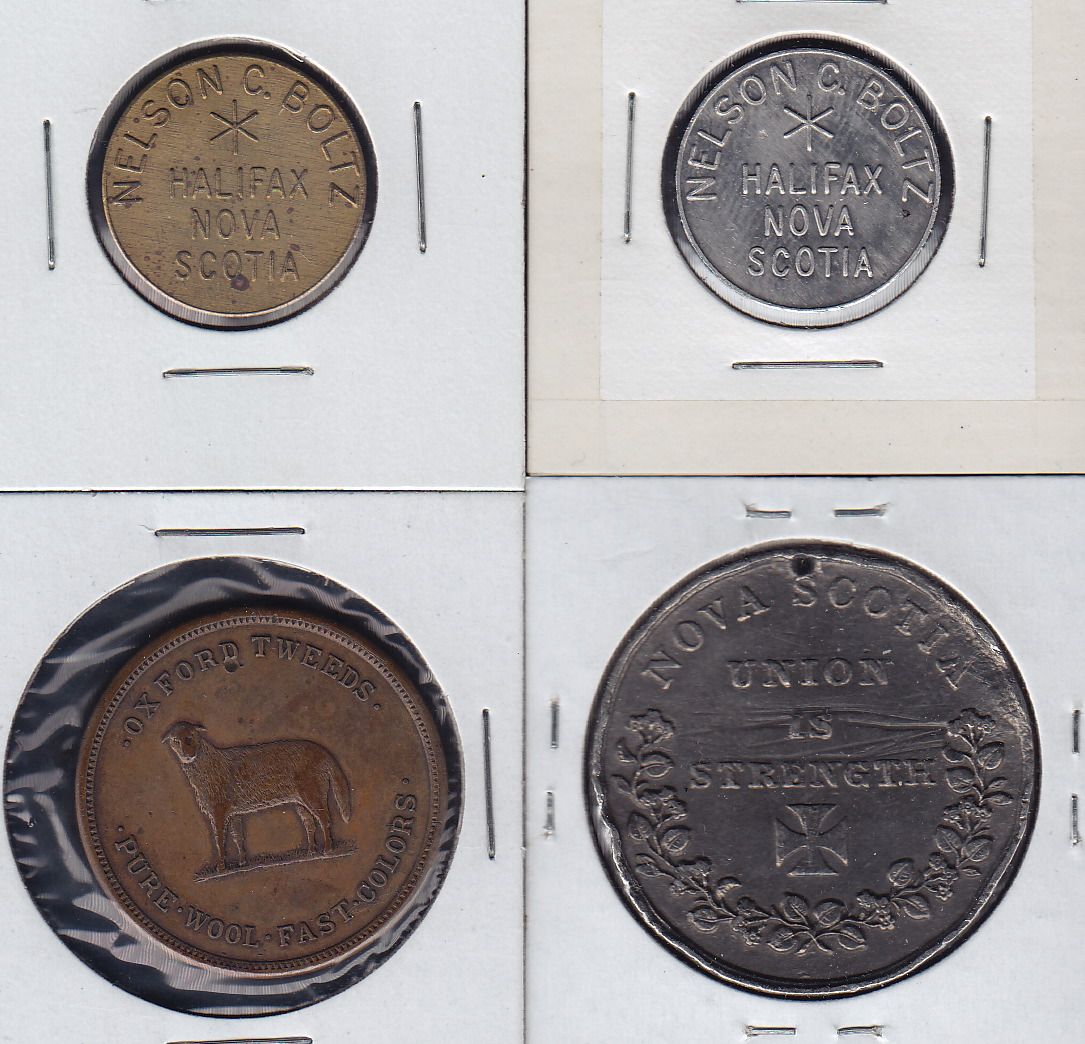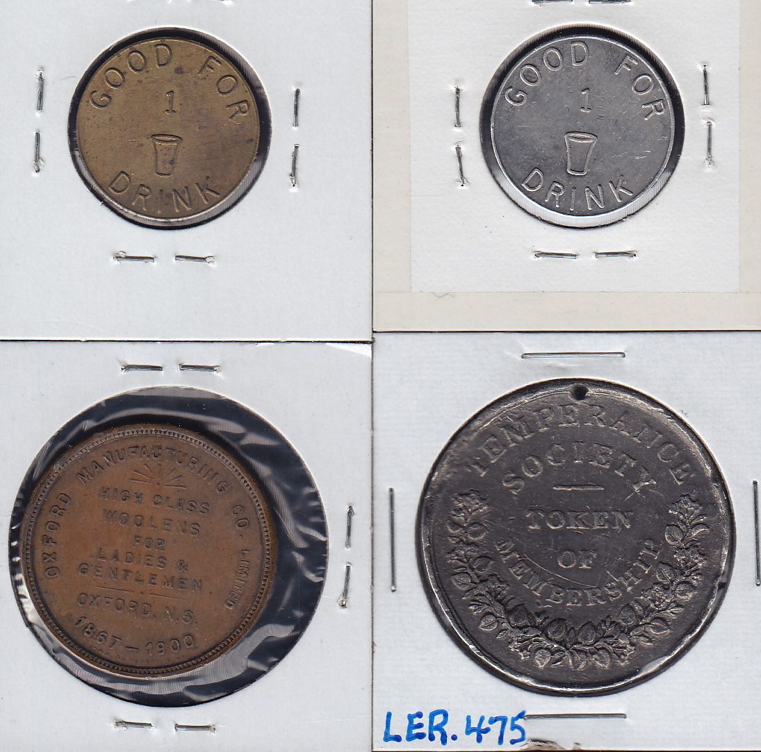 Nova Scotia Medallions. Oxford Tweeds, Oxford, NS, bronze, EF, Leroux 475, NS Temperance Society, holed at top, white metal, VF, light scratches, Nelson Boltz, Halifax, NS, 1 drink, Al and brass, both AU. 4 Pcs.