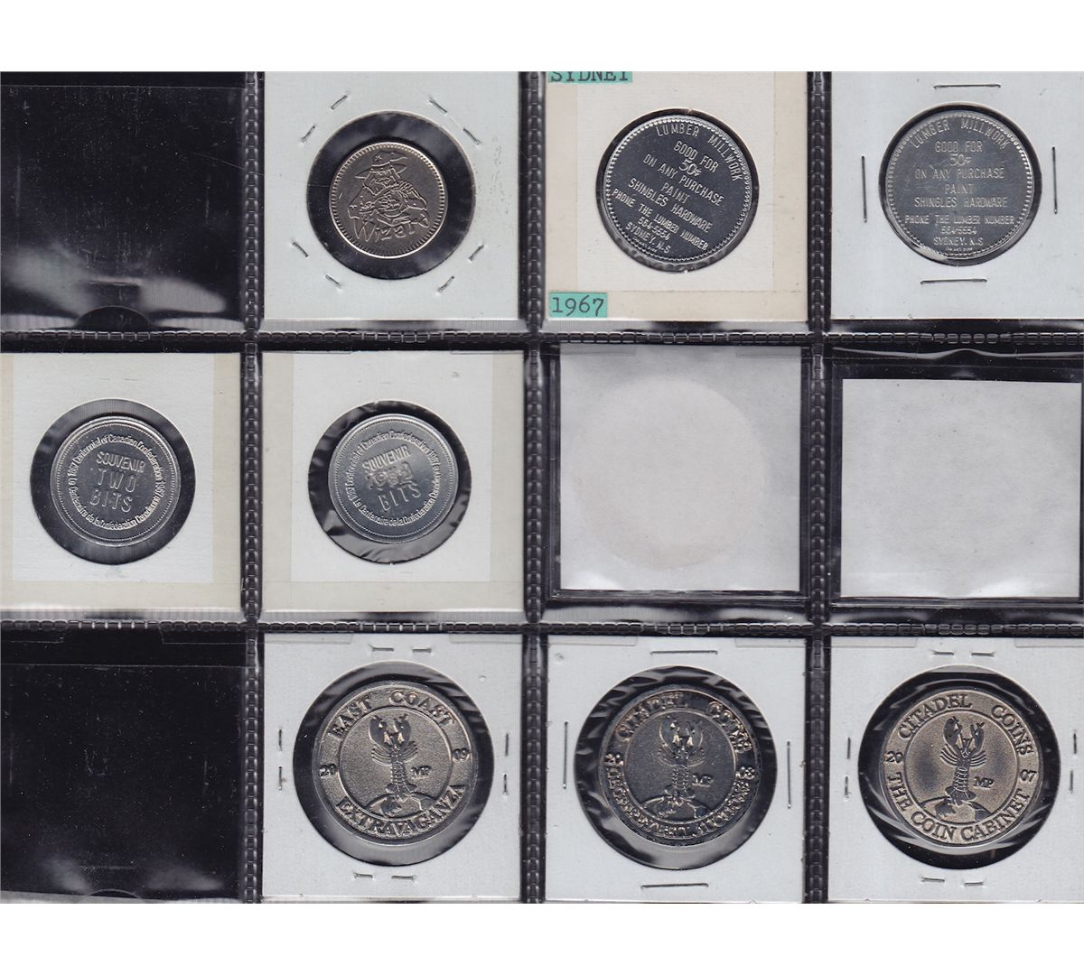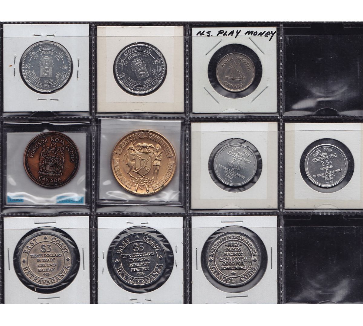 Nova Scotia Odds and Sods. East Coast Extravaganza, Halifax, NS, 2007, 2008, 2009, white metal, $3.00, Birthplace of Hockey, Windsor, NS, copper, UNC, Canadian Amateur, Swimming Association, uniface, brass, UNC, Nova Scotia Play Money, white metal, UNC, Kinsmen Club, Sydney, NS, 25 cents, C/S 1980, UNC, Al, Same specimen with no counterstamp, Al, UNC, J.W. Stephens, Sydney, NS, 1967, 50 cents, AL, UNC x2. 10 Pcs.