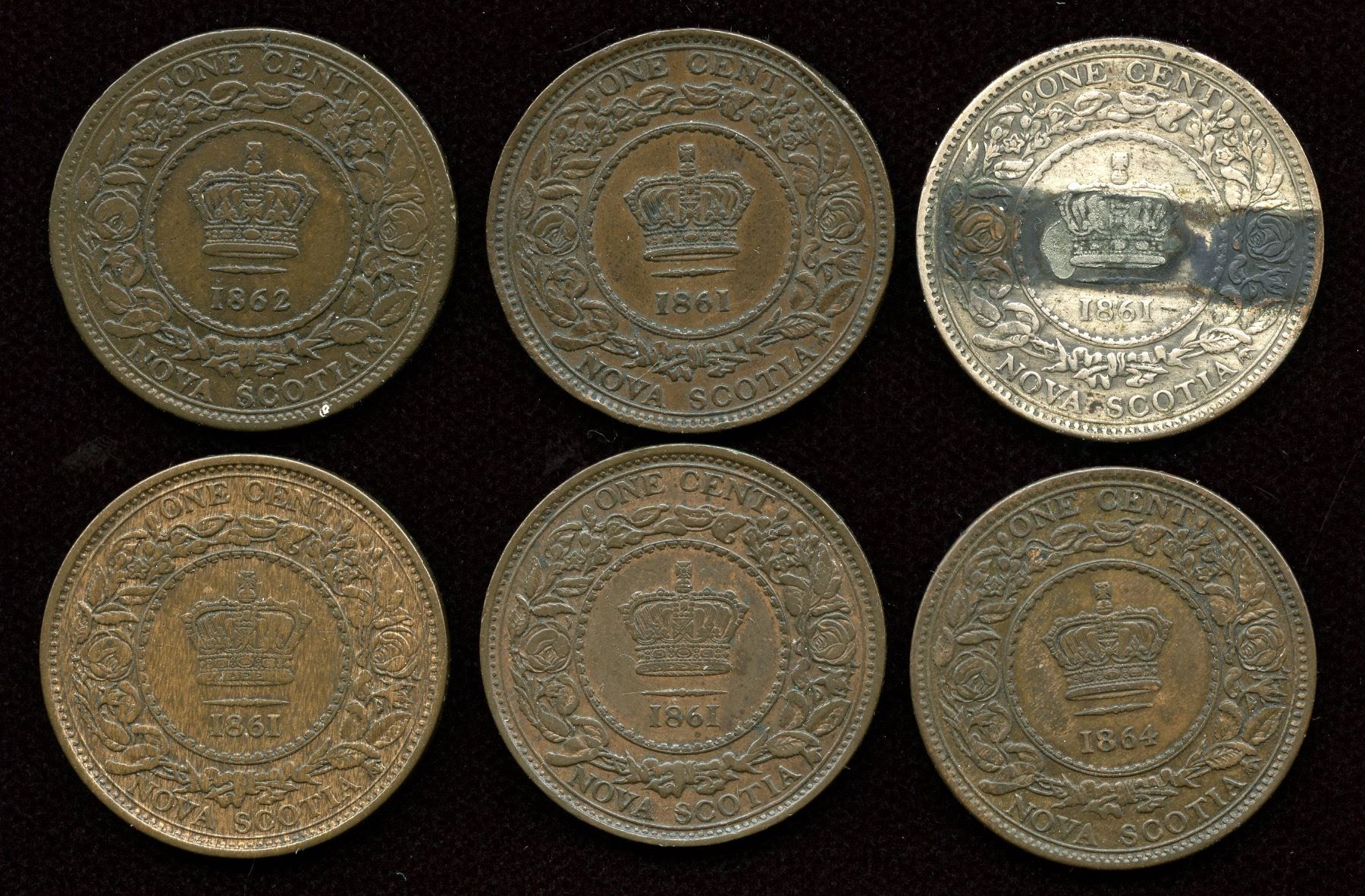 1861 One Cent, Small Rosebud, EF; Same as previous but, Silvered, F/VF; 1861 One Cent, Large Rosebud, EF; Same as previous but VF; 1862 One Cent, VG/F, key date; 1864 One Cent, EF. 6 Pcs.