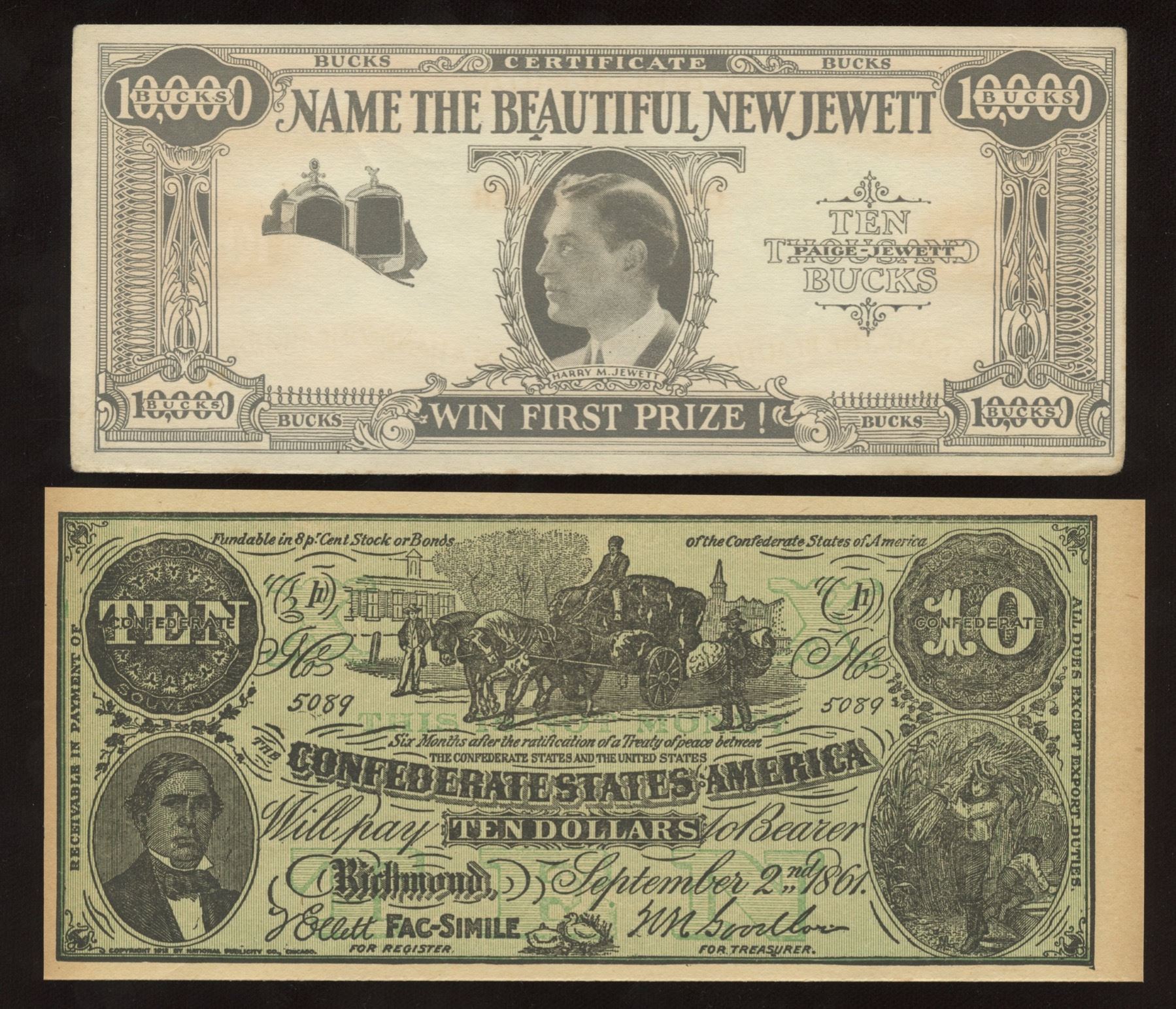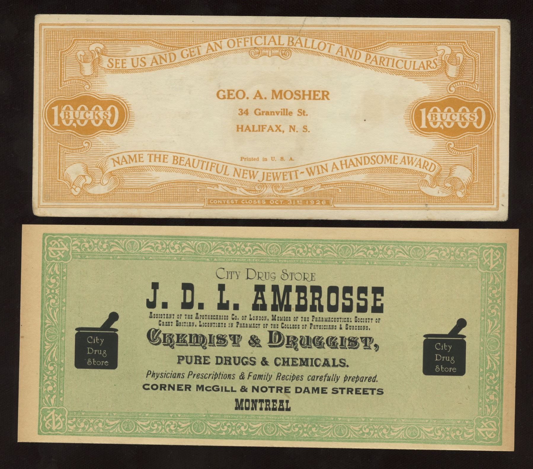 Lot includes: Geo. A. Mosher, Name the Beautiful Jewett, 10,000 bucks, an early contest note, picture of Harry M. Jewett. Also, J.D.L. Ambrosse Chemist & Druggist, Montreal. 2 cool advertising pieces.