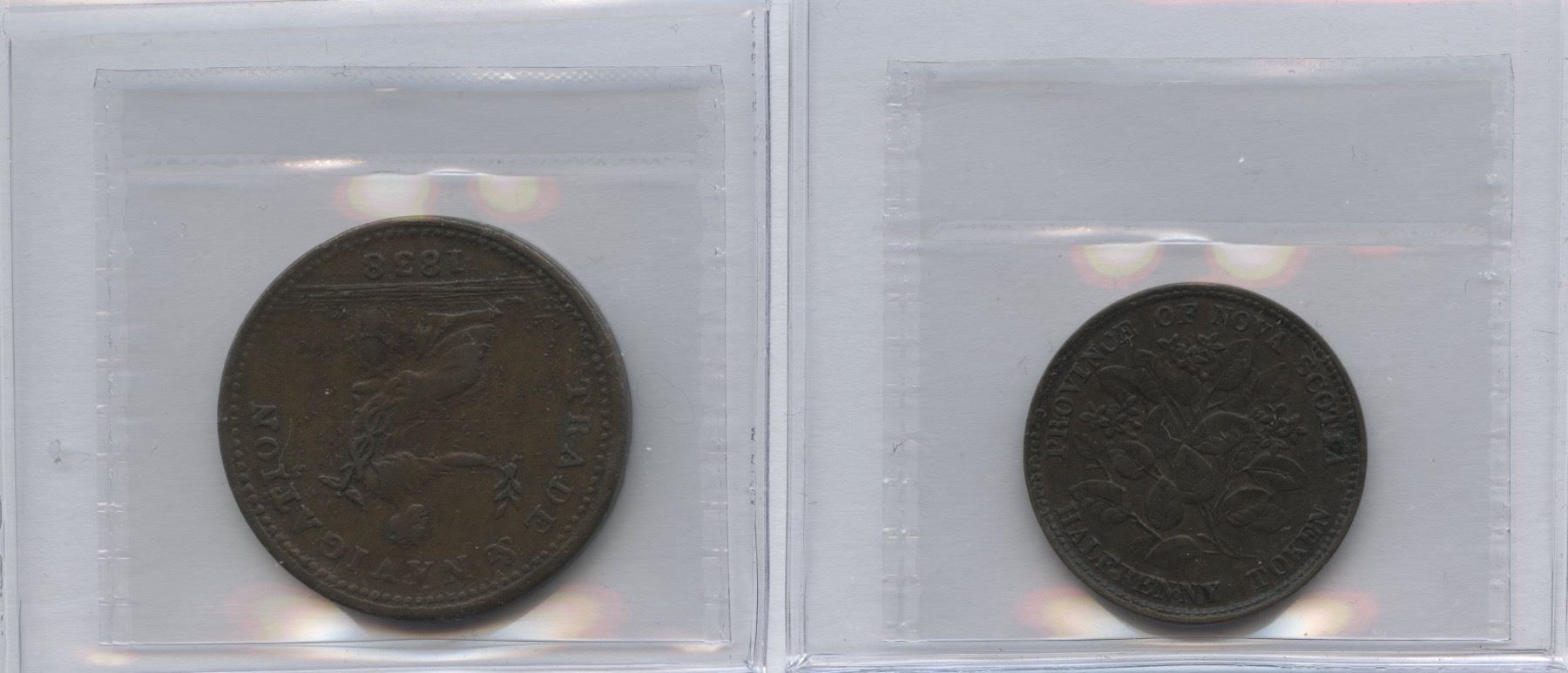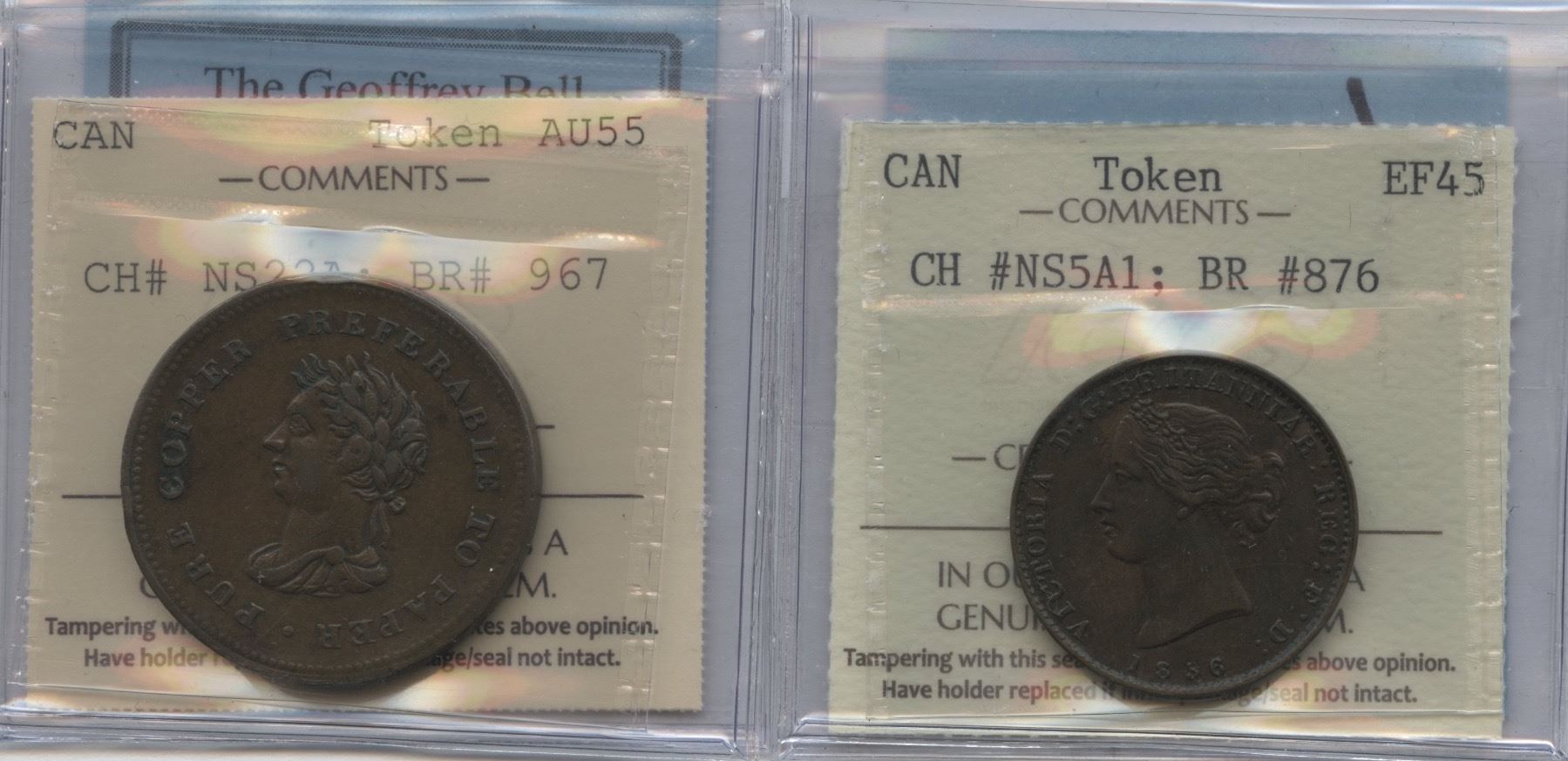 Tokens from the Geoffrey Bell Collection sold at 2015 GBA Spring Expo Sale. ICCS EF-45 CH# NS-51A, Breton 876, Part of Lot 143; ICCS AU-55 CH# NS-22A, Breton 967, Lot 318. The original tag, signed by Geoff Bell, for each coin is included. 2 Pcs.