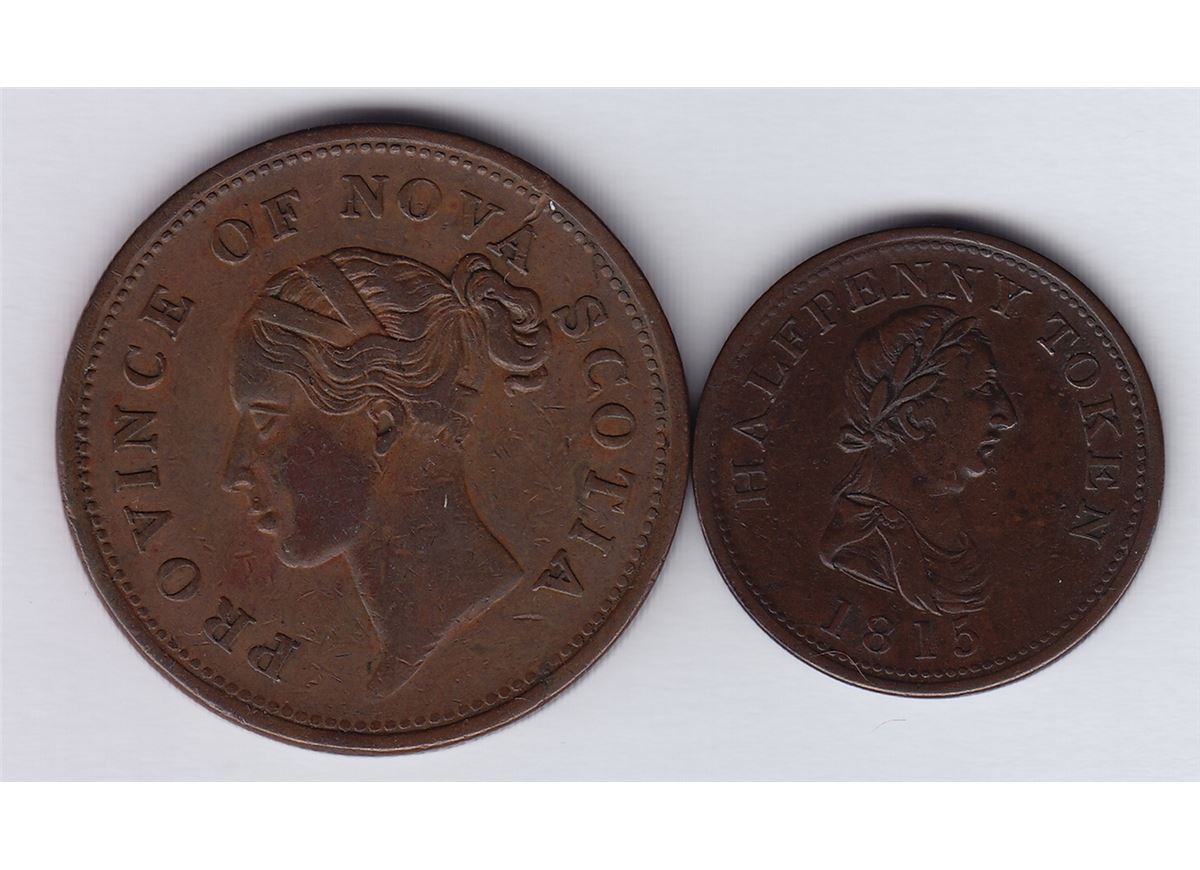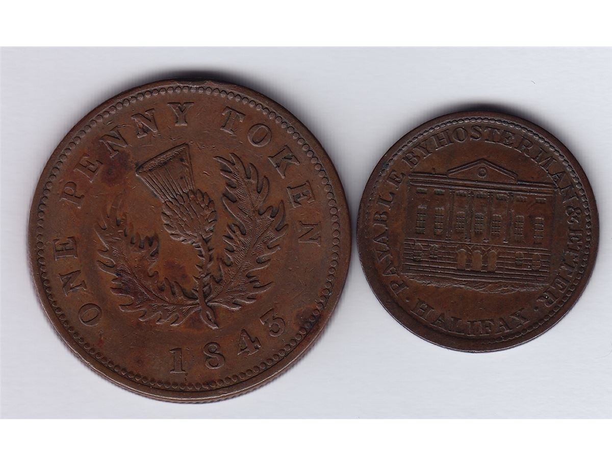 Nova Scotia Token Lot of Two Includes: Courteau 314, BR 873, CH NS-2D1, 1843 One Penny, EF; Courteau 336, BR 883, CH NS-10B1, 1815 Halfpenny, VF. 2 Pcs.