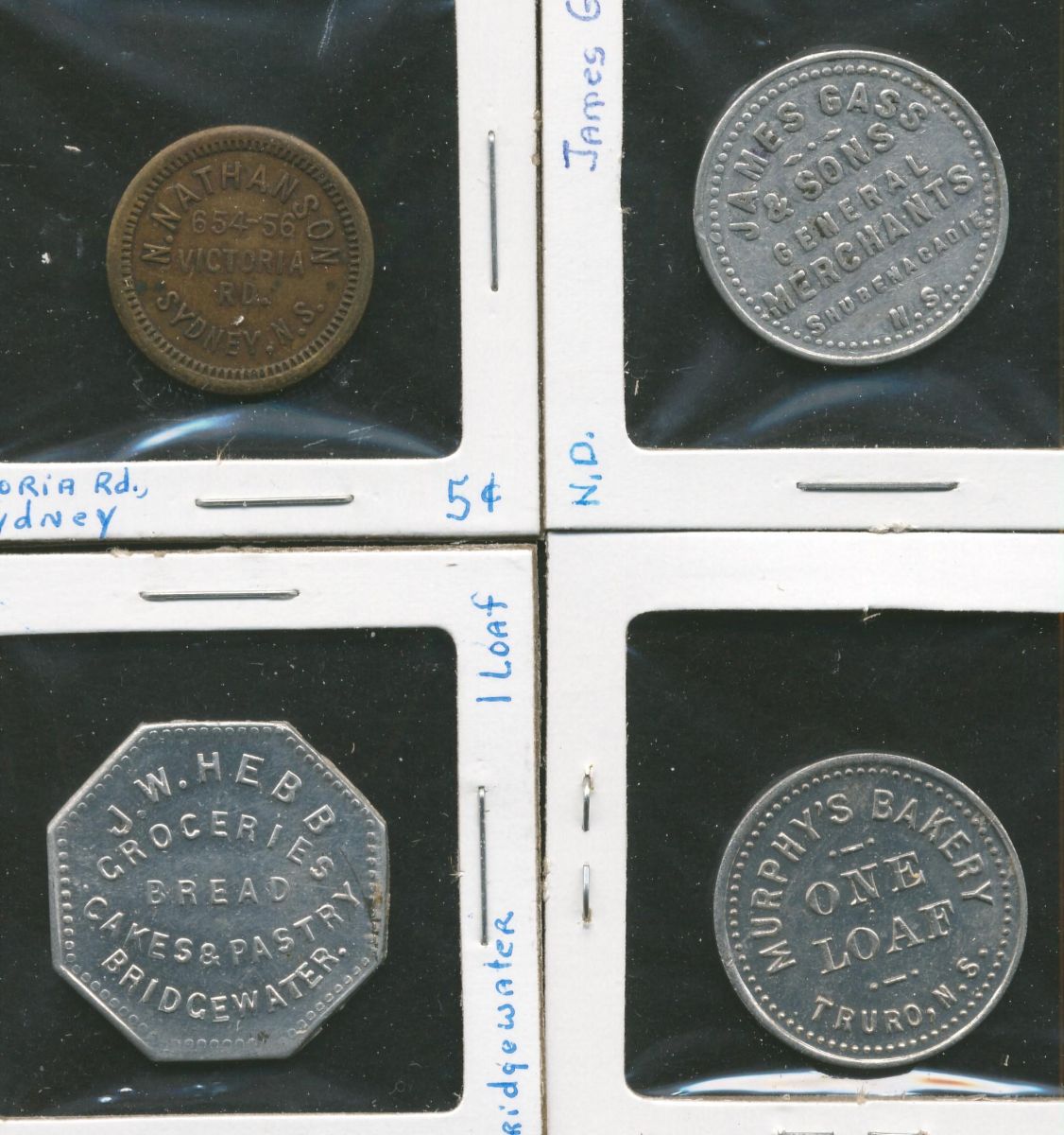 James Gass, Shuebenacadie, Nathanson, Sydney, Murphy's, Truro, Hebb, Bridgewater, 4 pcs.