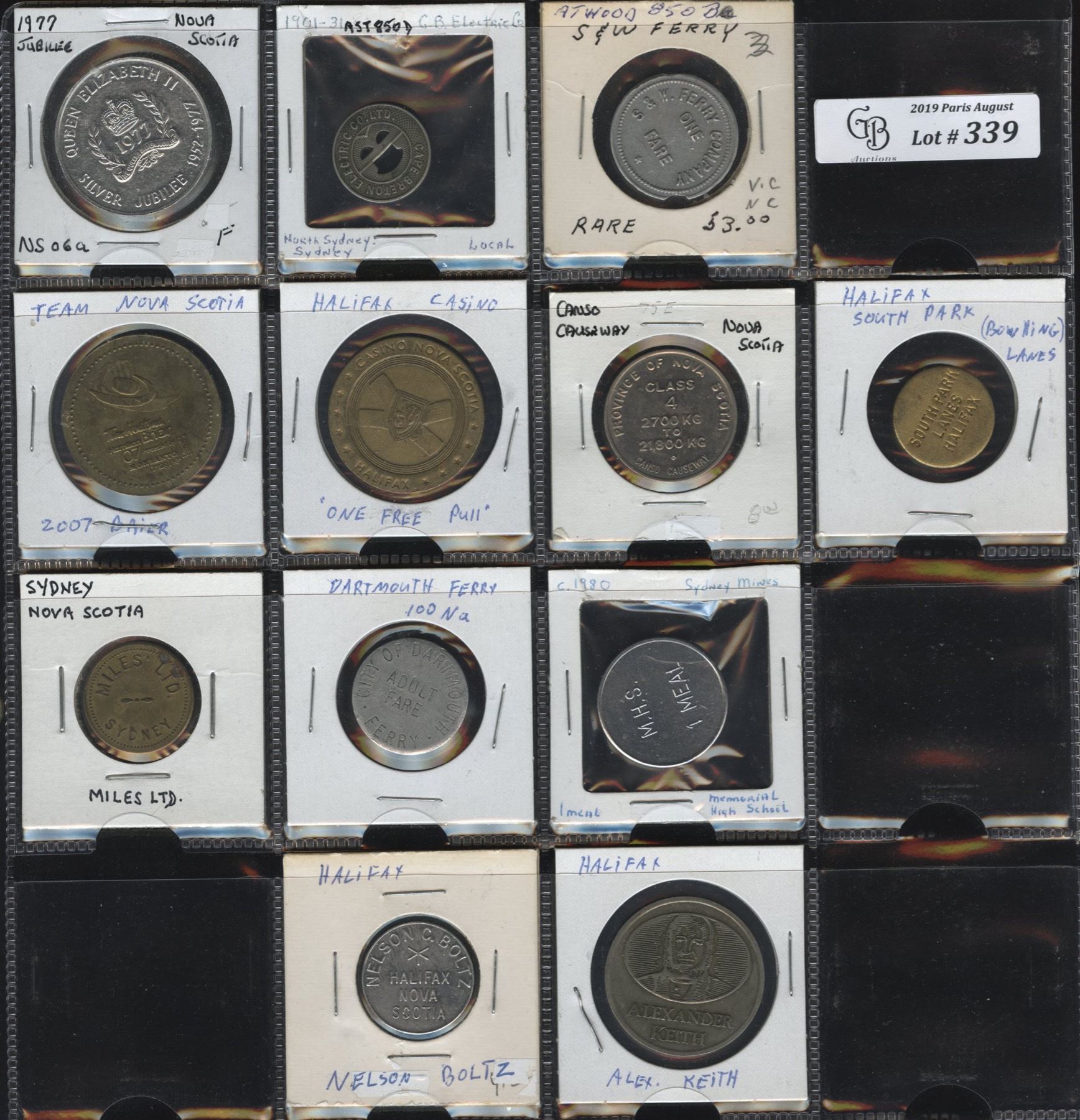 Twelve tokens from Nova Scotia, representing transportation, paring, drink, meal, and a casino. Including scarce ferry token from Sydney, though marred. Also, a very nice Queen's Jubilee medallion. 12 Pcs.