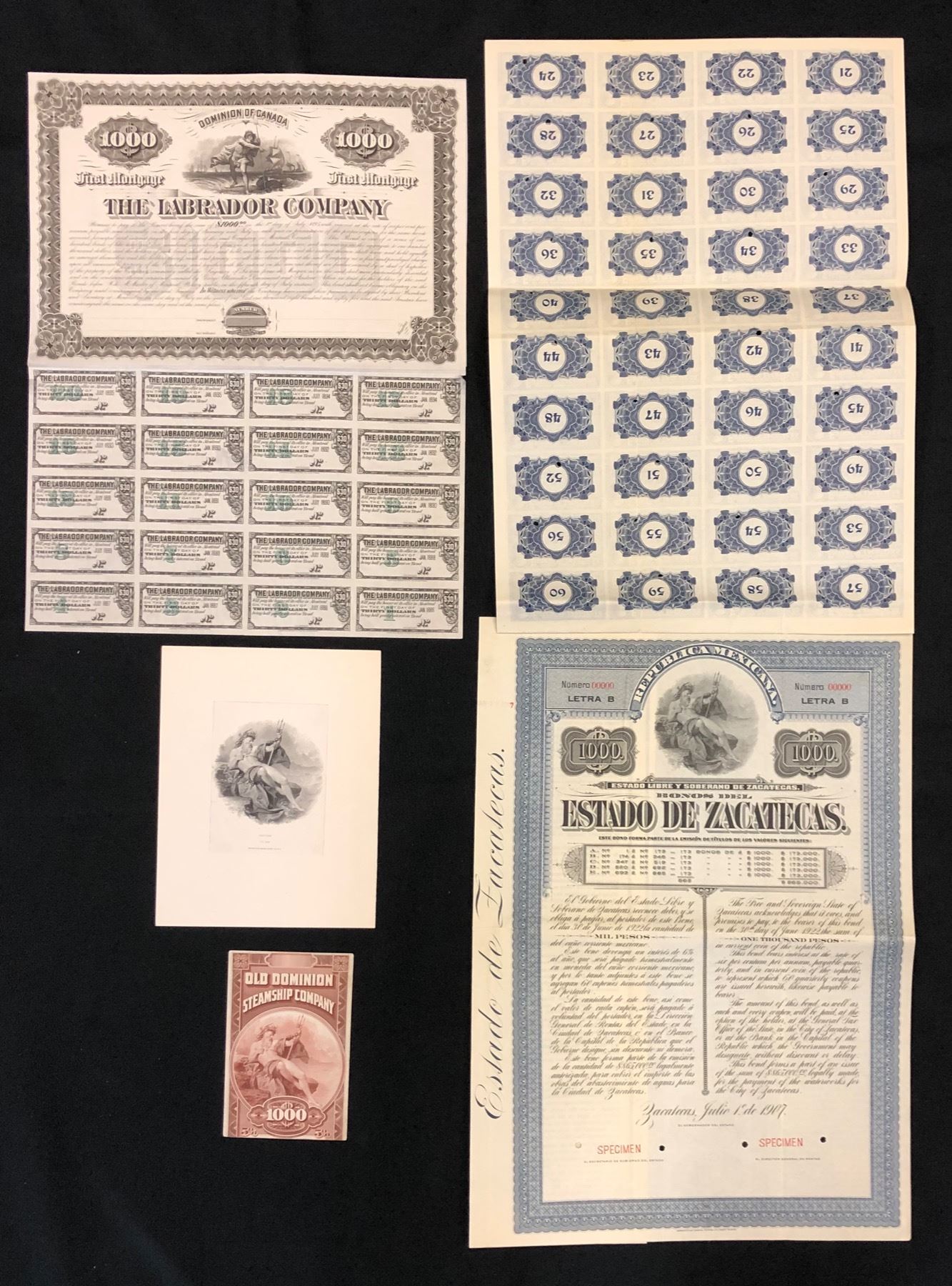 Nucleus of a King Neptune topical collection: ABN vignette, C-513 on card; same vignette on a Mexican bond, State of Zacatecas, Specimen $1,000 1907, complete with sixty interest coupons; same vignette again on piece of Old Dominion Steamship Co. $1,000 bond, proof on card; The Labrador Company, First Mortgage Bond, $1000, Canada Bank Note Co. proof attached to ledger paper, with twenty interest coupons, one area of thinning affects back only of one coupon, the latter with a different vignette of King Neptune. Total of four items.