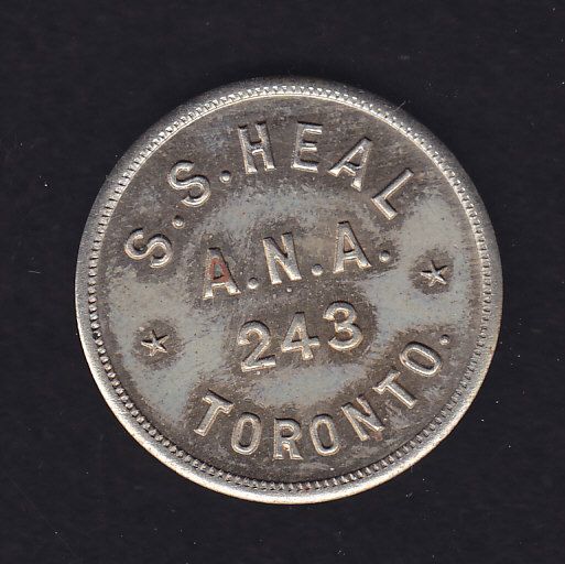 Numismatic Card - Mc 836. S.S. Heal/ A.N.A./ 243/ Toronto. Rev: Coins, Medals and Tokens. WM, 25mm, UNC. McColl claims 50 struck.