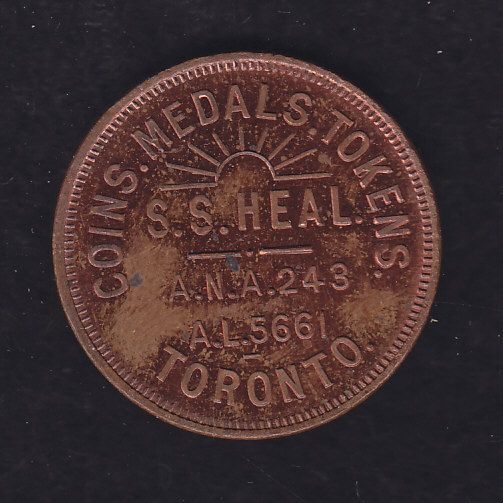 Numismatic Card - Mc 837. Coins, Medals, Tokens/ S.S. Heal/ A.N.A. 243/ A.L. 5661/ Toronto. Rev: Cheval. Copper, 25mm, Unc. McColl claims 75 struck.