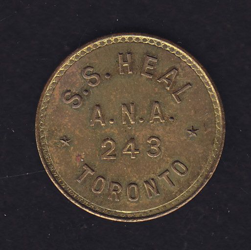 Numismatic Card - Mc 840. S.S. Heal/ A.N.A./ 243/ Toronto. Rev: Coins, Medals, (Oak Leaf) Tokens. Brass, 25mm, UNC.