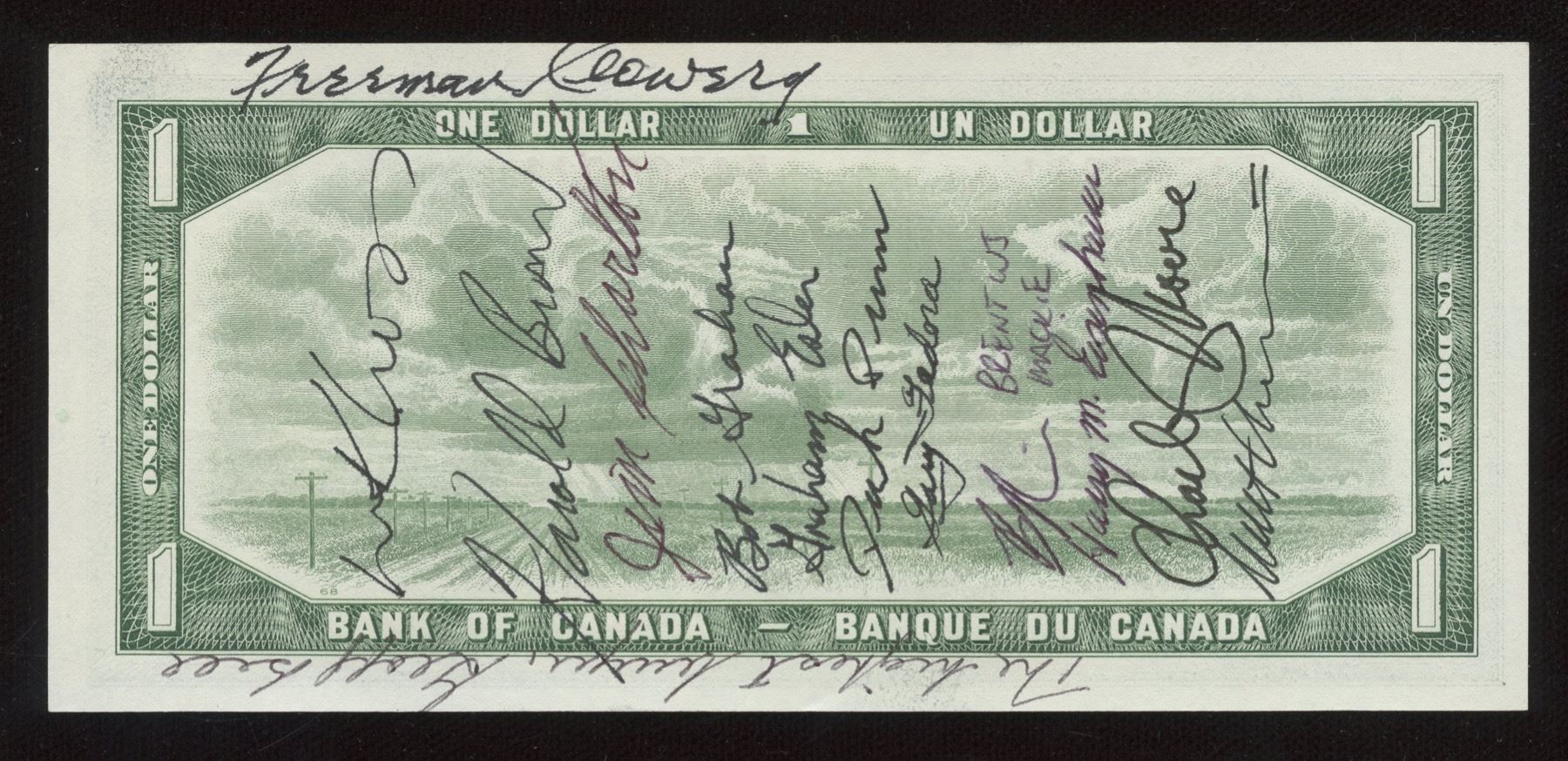 Includes many of numismatic pioneers; such as Jim Charlton, Harry Eisenhauer, Freeman Clowry, Charles Moore, Bob Graham, Graham Esler, even Geoffrey Bell among others! This particular note was presented to Don Olmstead.