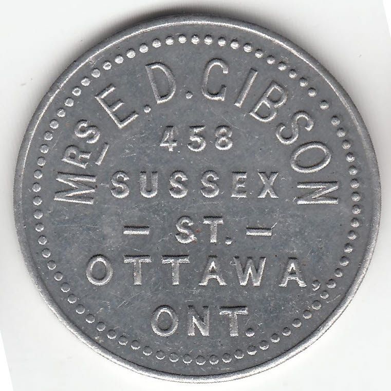 Numismatist Card. Mrs E.D. Gibson/ 458/ Sussex/ St./ Ottawa/ Ont. Rev: Stamp/ and/ Coin Dealer. Aluminum, 30mm, Unc.
