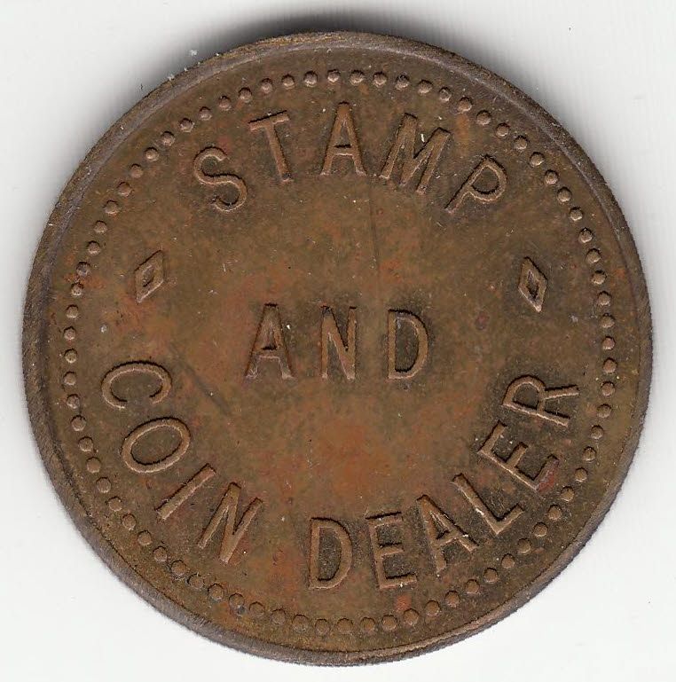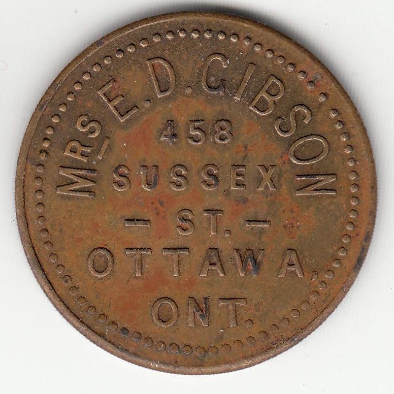Numismatist Card. Mrs E.D. Gibson/ 458/ Sussex/ St./ Ottawa/ Ont. Rev: Stamp/ and/ Coin Dealer. Brass, 30mm, EF.
