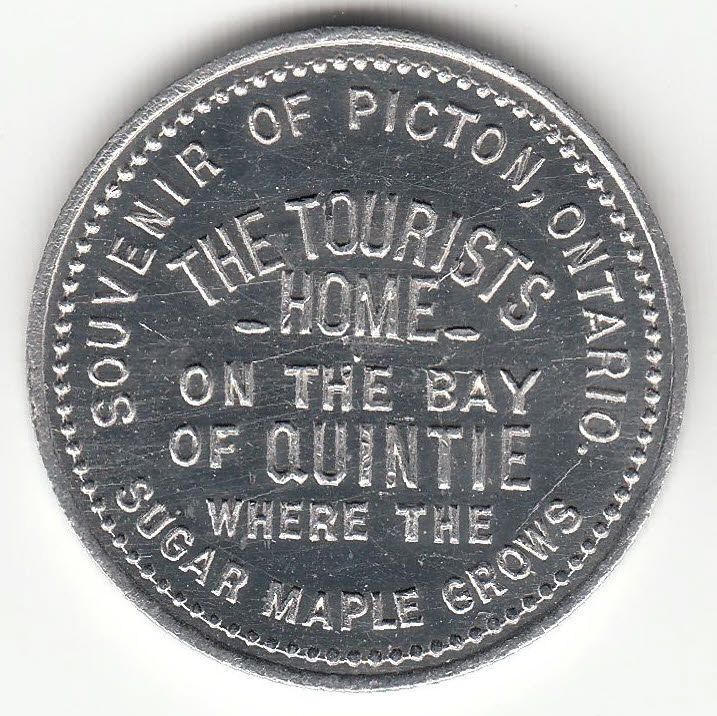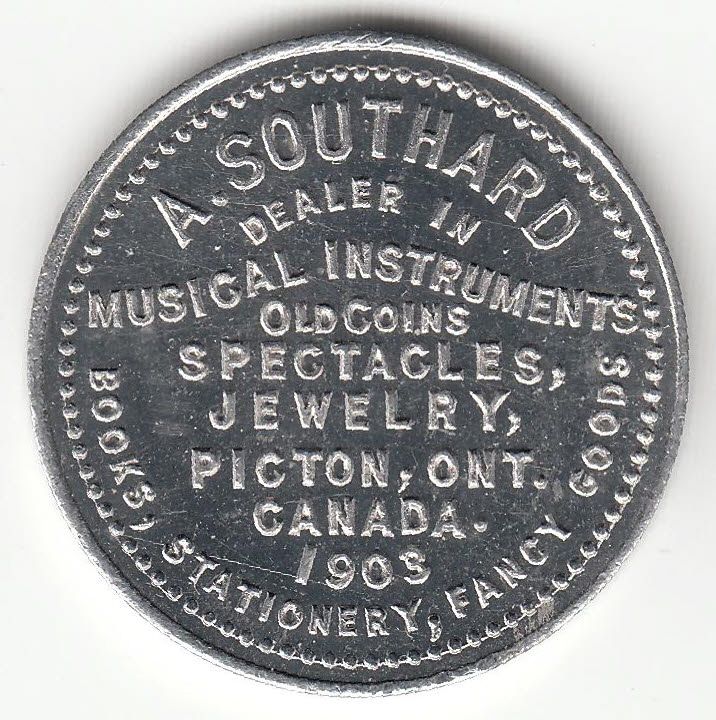 Numismatist Card. A. Southard/ Dealer in/ Musical Instruments/ Old Coins/ Spectacles,/ Jewelry,/ Picton, Ont./ Canada./ 1903/ Books, Stationary, Fancy Goods. Rev: Souvenir of Picton, Ontario./ The Tourists/ Home/ on the Bay/ of Quintie/ where the/ Sugar Maple Grows. Aluminum, 28mm, Unc.