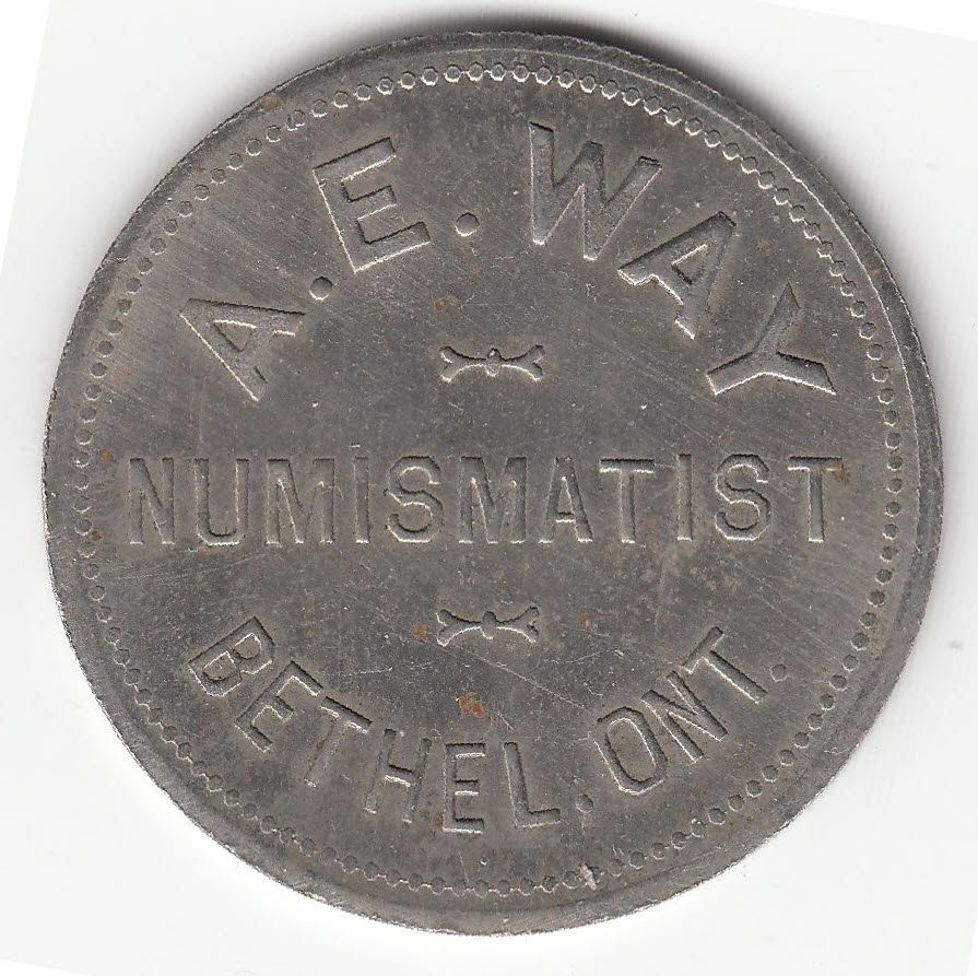 Numismatist Card. A.E. Way/ Numismatist/ Bethel, Ont. Rev: Rare Coins/ Tokens/ &/ Medals. WM, 35mm, EF.Way's ANA number was 581 (1904) and issued 25 pieces in WM.