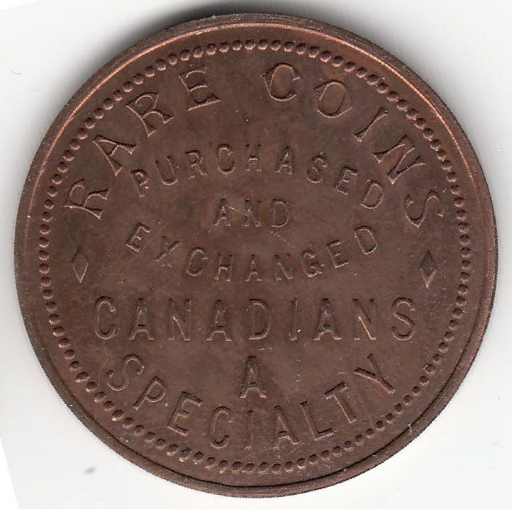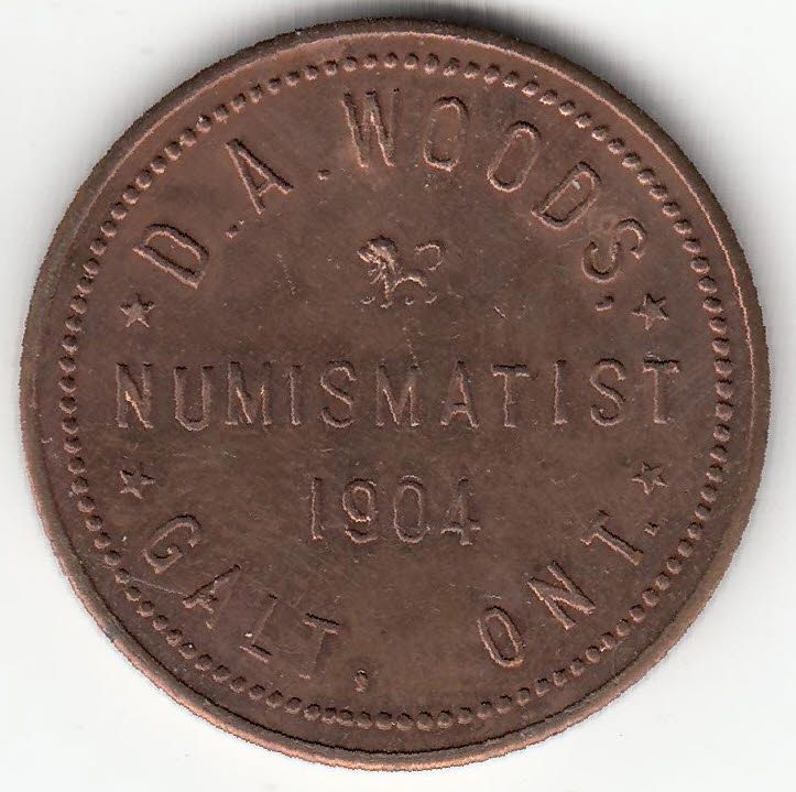 Numismatist Card. D.A. Woods,/ Numismatist/ 1904/ Galt, Ont. Rev: Rare Coins/ Purchased/and/ Exchanged/ Canadians/ a/ Specialty. Copper, 29mm, Unc. Woods' ANA number was 559 and issued 200 pieces in copper.