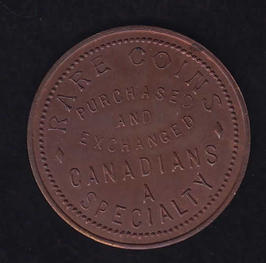 Numismatist Card. - D.A. Woods,/ Numismatist/ 1904/ Galt, Ont. Rev: Rare Coins/ Purchased/and/ Exchanged/ Canadians/ a/ Specialty. Copper, 29mm, Unc. Woods' ANA number was 559 and issued 200 pieces in copper.