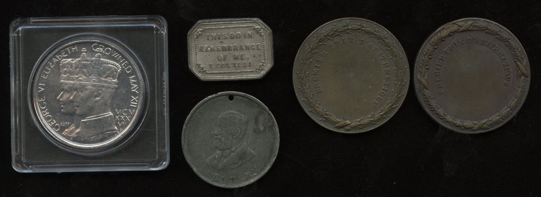 1937 coronation aluminum medallion of George VI and Elizabeth; Ler 1515, Stanley; communion token from Orillia, ON, CH CW-302; Ludger Gravel medal in brass; Ludger Gravel medal in copper. 5 Pcs.