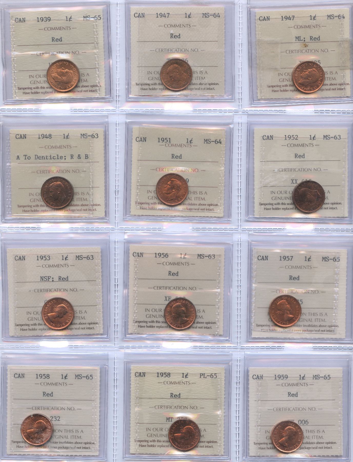 Includes: 1939 MS-65, Red. 1947 MS-64, ML; Red. 1947 MS-64, Red. 1948 MS-63, A to Denticle; R&B. 1951 MS-64, Red. 1952 MS-63, Red. 1953 MS-63, NSF; Red. 1956 MS-63, Red. 1957 MS-65, Red. 1958 MS-65, Red. 1958 PL-65, Red. 1959 MS-65, Red. 1959 PL-65, Red. 1960 MS-65, Red. 1961 PL-64, Red; Ultra Heavy Cameo. 1963 MS-65, Red; Hanging 3. 1963 PL-65, Red; Cameo. 1964 PL-65, Red; Heavy Cameo. 1966 PL-64, Red; Heavy Cameo. 1967 MS-64, Red. 1967 PL-65, Red; Heavy Cameo. 1971 PL-65, Red; Heavy Cameo. 1982 MS-65. 1983 MS-65. 1986 MS-65. 1991 MS-66, Red; NBU. 1996 MS-64, Red. 27 pcs.