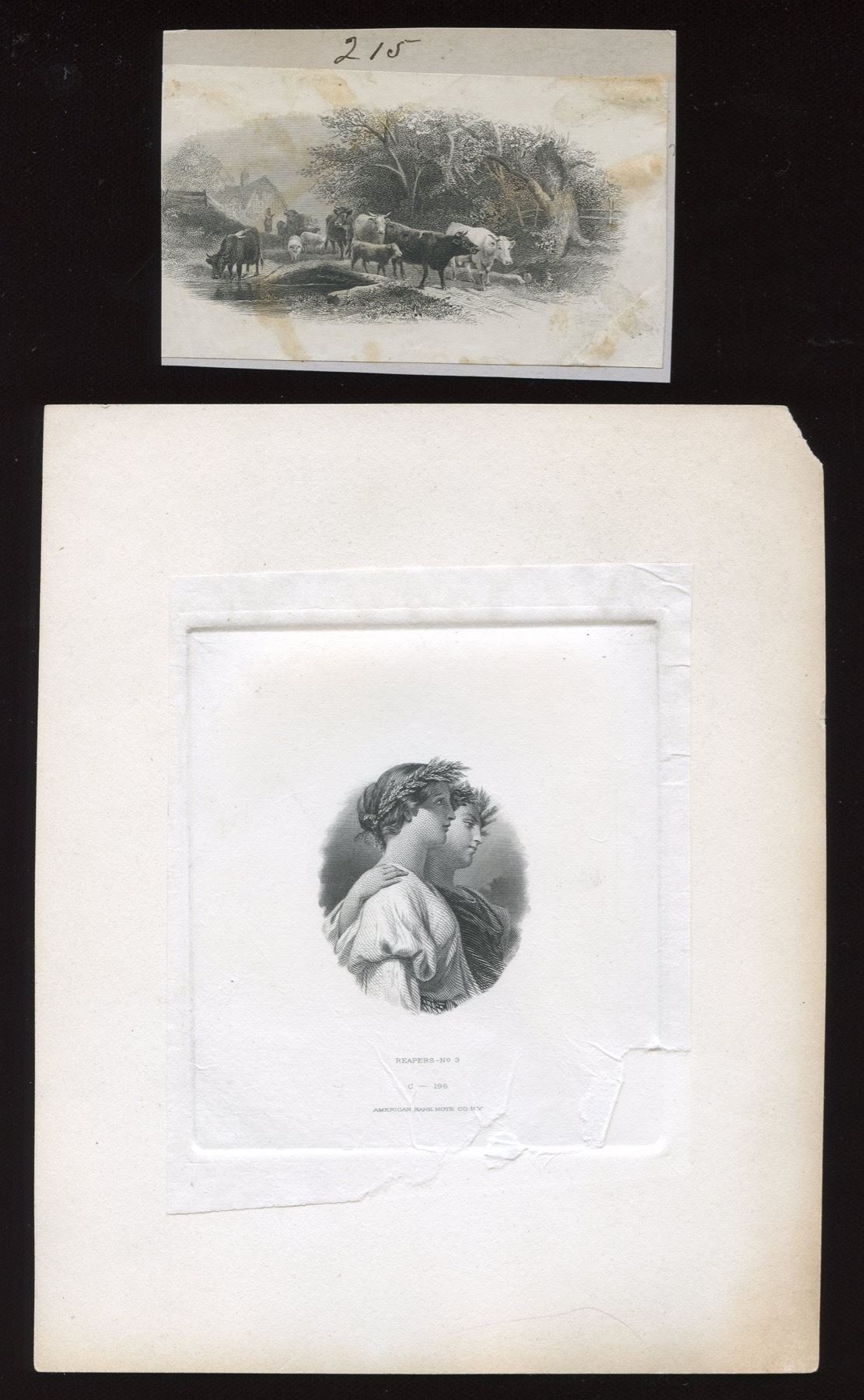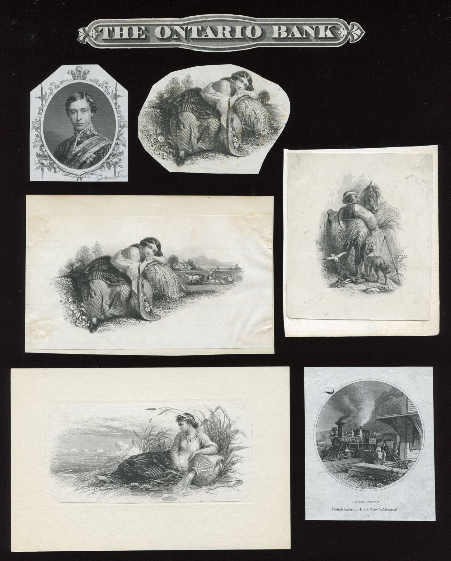 Ontario Bank, woman resting on hay (1860 $20), another without background scenery at right, cut down; Prince of Wales (1860 $100); "On the Switch" (1882 $5) cattle (1882 $10); Old Birhans (1888 $5); "Reapers #2" with some damage (1888 $20); woman with water jar (1888 $50). Eight die proof vignettes, plus engraved bank name.