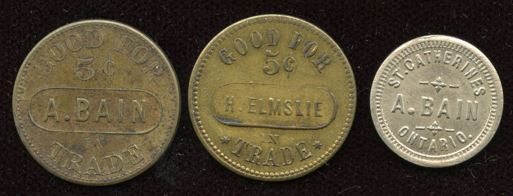 Br. 749, A. Bain, 5 cents, brass, AU; Br. 750. A. Bain, 5 cents, German silver, BU; Br. 752, H. Elmslie, 5 cents, brass, Unc. 3 Pcs.