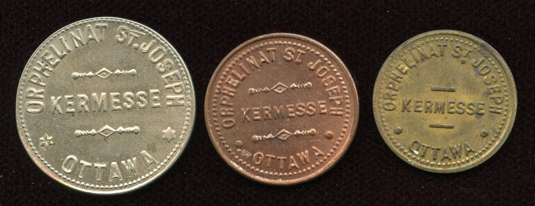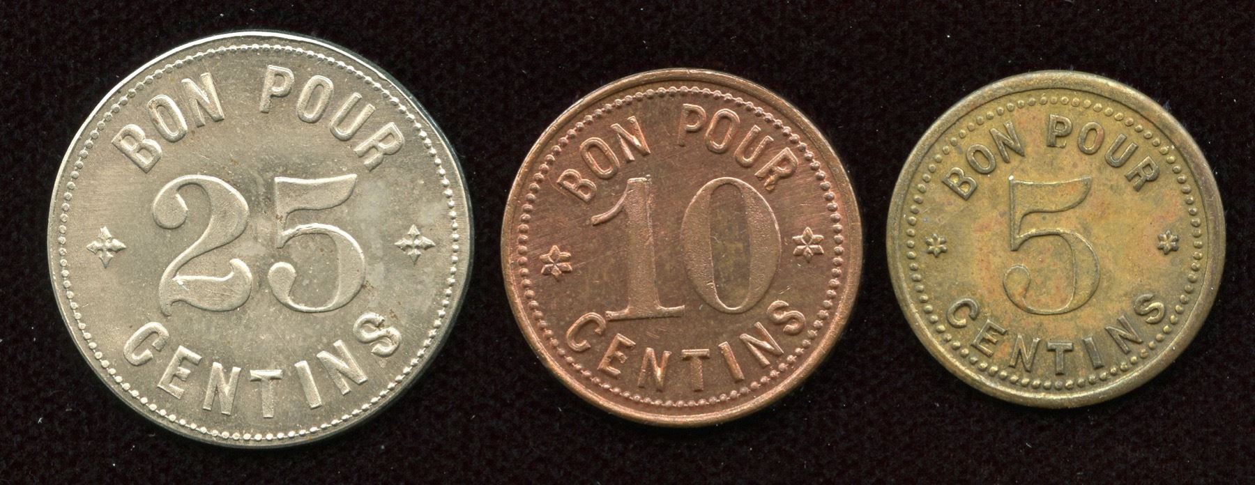 Br. 799, Orphelinat, 25 centins, German silver, BU; Br. 800, Orphelinat, 10 centins, copper, BU; Br. 801, Orphelinat, 5 centins, brass, Unc. 3 Pcs.