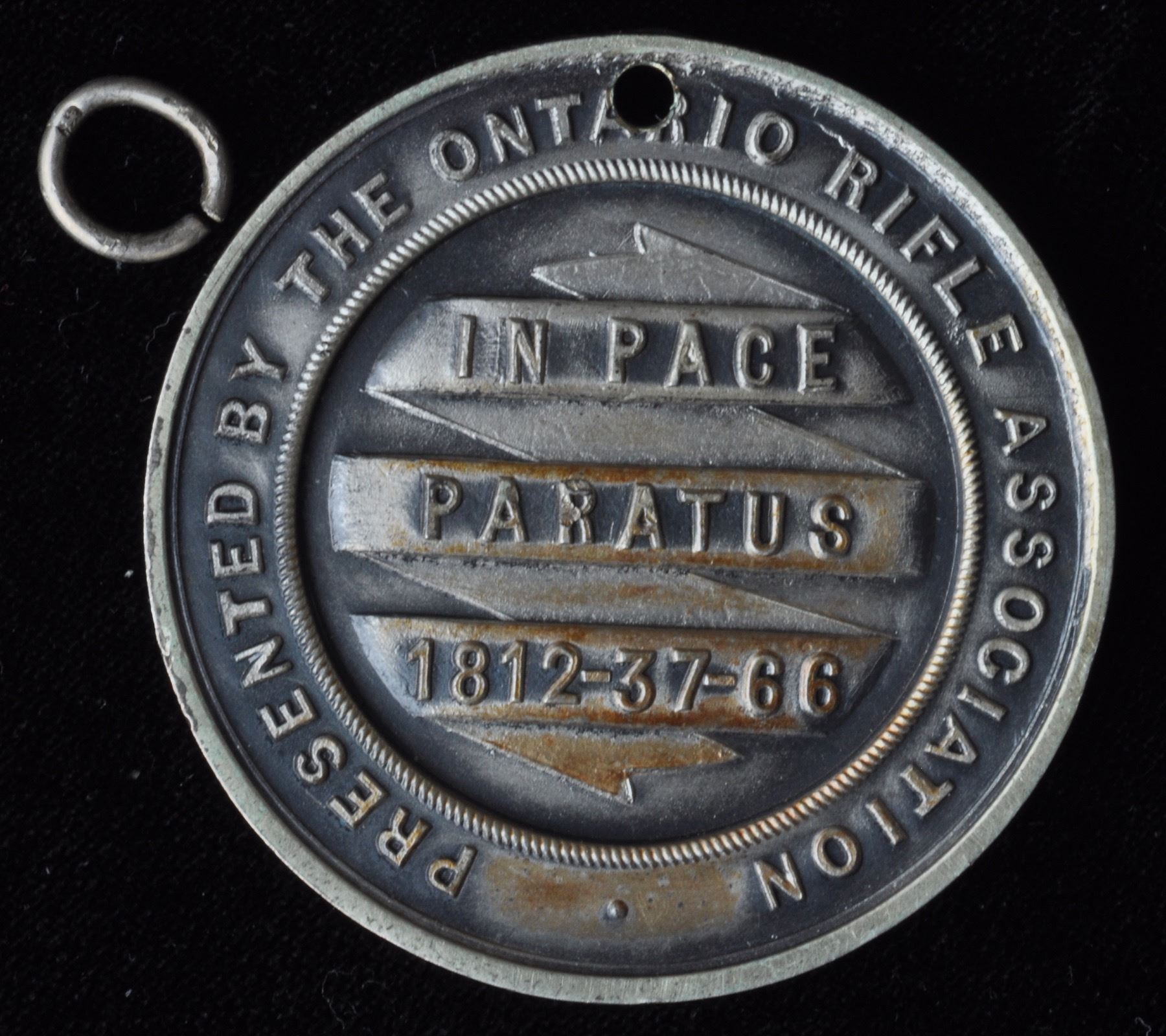 Ler 1601 Ontario Rifle Association with edge inscription M.J.M Watson 1938. Silver, 39mm, 33.9 gms, drilled for suspension at top. Maker Bailey. EF.