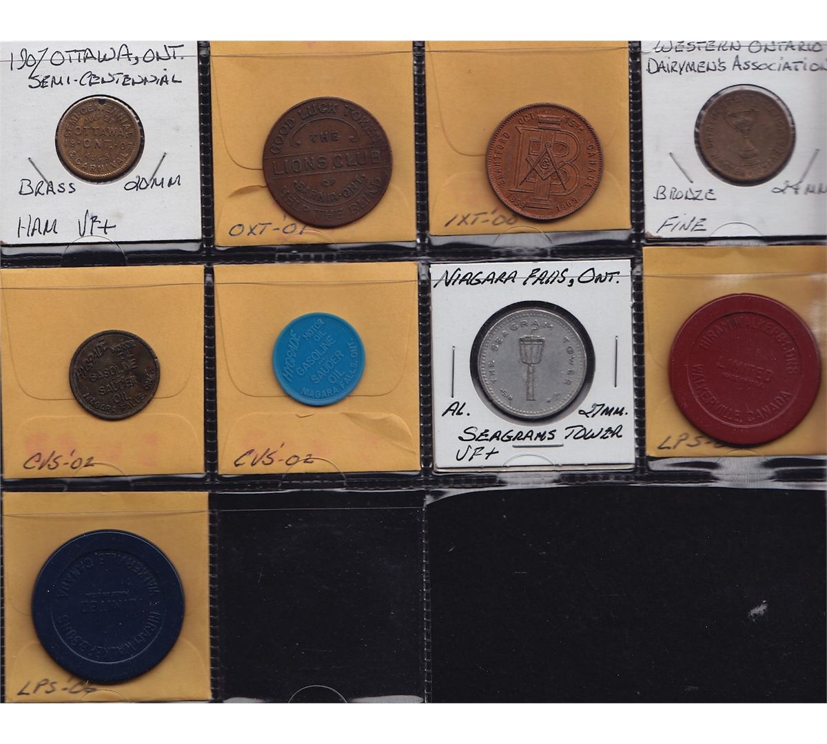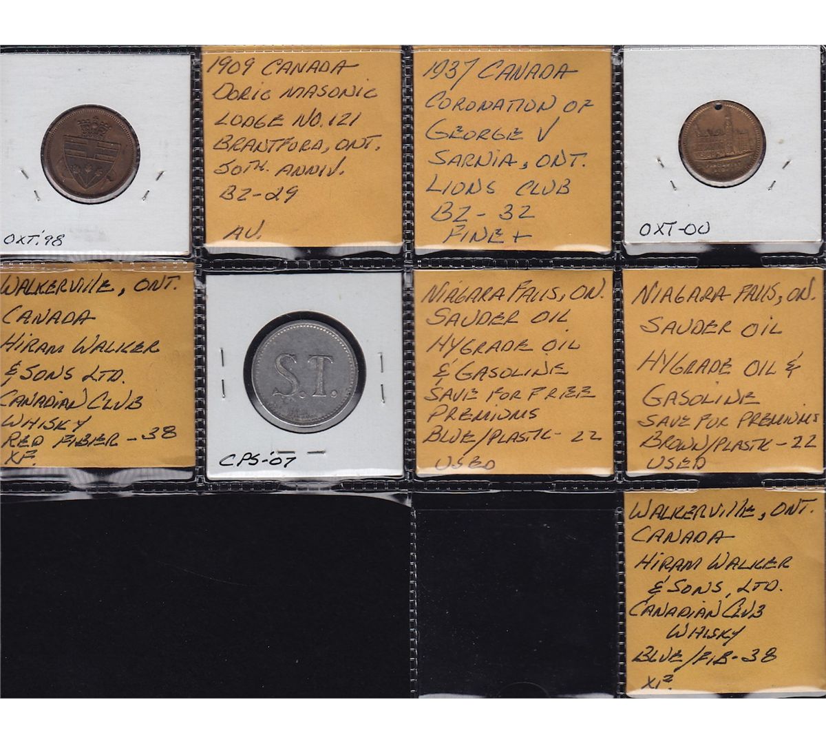 Ontario Medallions. 1907 Ottawa Semi-Centennial Carnival, rev. Parliament Buildings, brass, AU, holed at top, 1937 Sarnia Lions Club to Commemorate the coronation of George VI and Elizabeth, bronze, EF, 1909 Doric Masonic Lodge, Brantford, copper, AU, Commemoration of Semicentennial, Undated Dairymen's Association, Western Ontario, bronze, EF, Trophy on obv, ON crest on rev., Seagram Tower, Niagara Falls, aluminum, VF, Niagara Falls, Gasoline & Oil, Sauder, plastic, brown and a second blue, Walkerville, Hiram Walker 7 Sons, Canadian Club Whisky, fibre, red and a second specimen blue. 9 Pcs.
