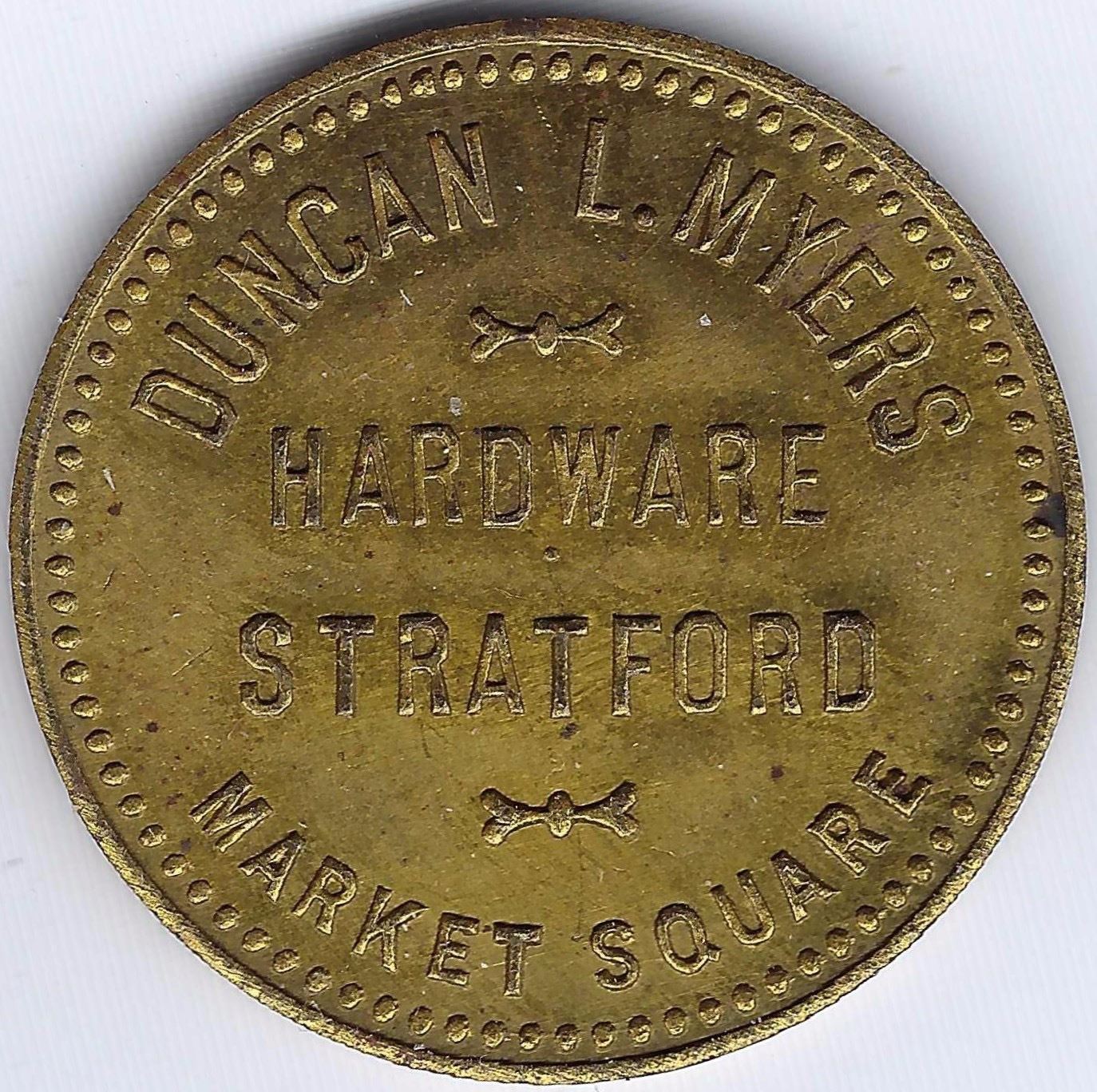 Ontario Perth County Stratford Duncan L. Meyers Hardware 1902 S.W.P. (Sherwin Williams Paint), McColl 450 Brass, 12 Made, 6.6g.