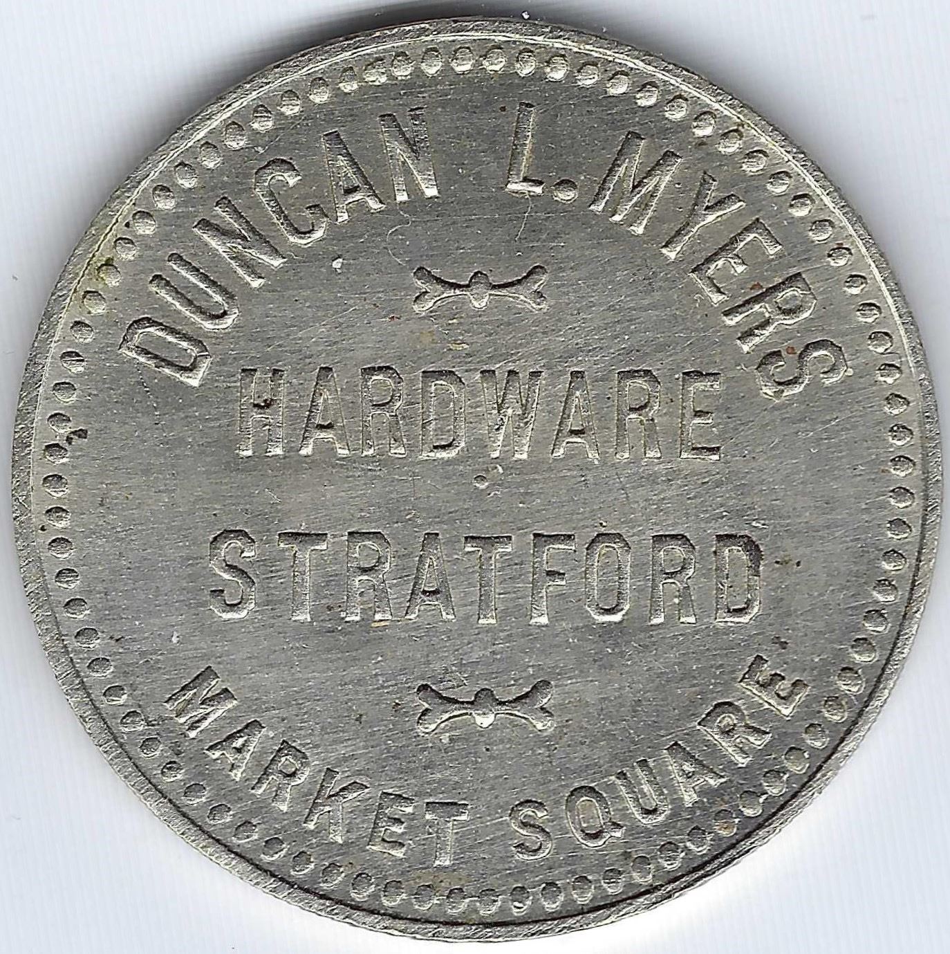 Ontario Perth County Stratford Duncan L. Meyers Hardware 1902 S.W.P. (Sherwin Williams Paint) McColl 451 German Silver, 12 made, 6.9g.