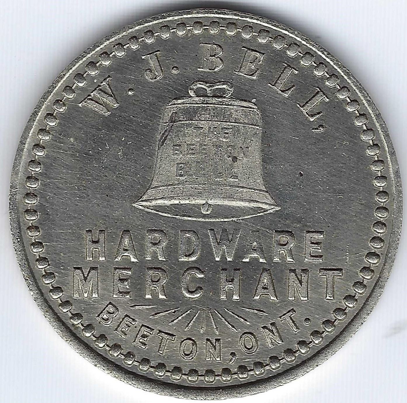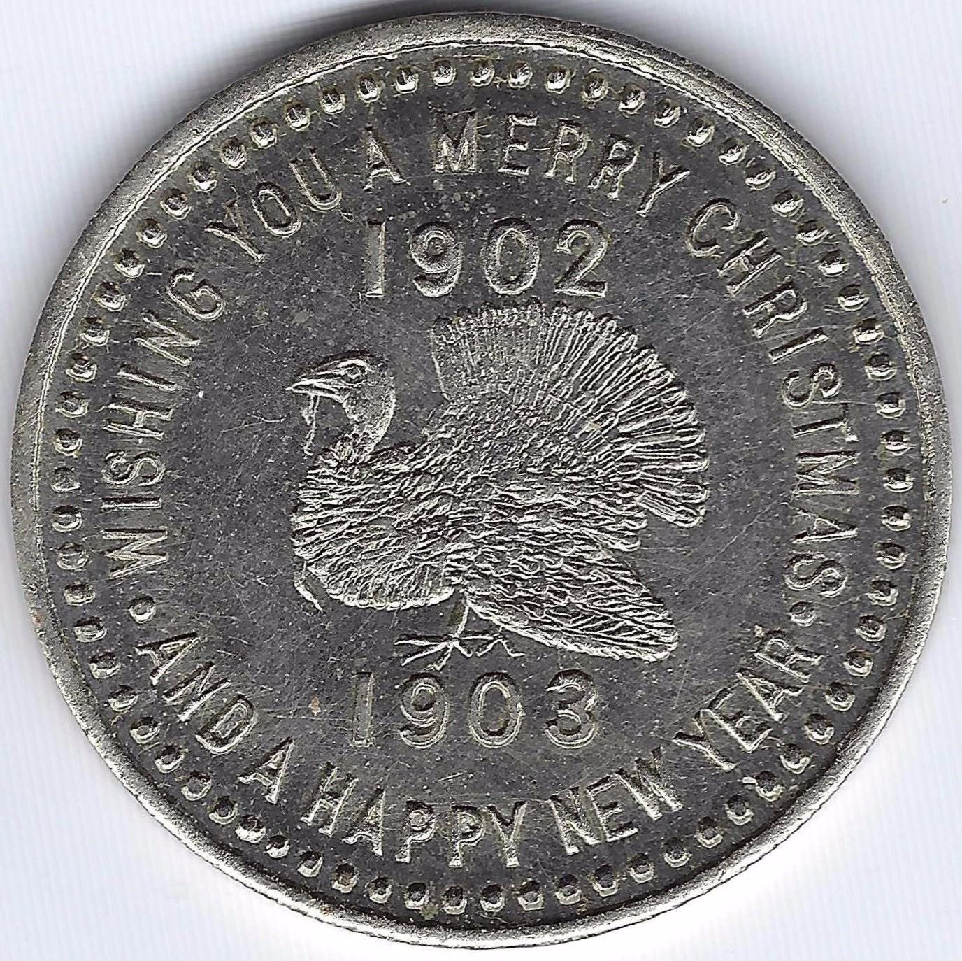 Ontario Simcoe County Beeton W.J. Bell Hardware Merchant, Merry Christmas 1902 / Happy New Year 1903 Turkey, by Cranston, McColl 495, German Silver, 10 Struck, 7.1g.