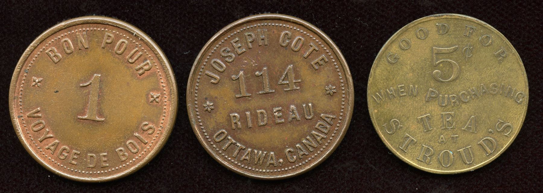 Br. 769, Elie Renaud, 1 Vayage de Bois, Copper, EF; Br. 784, Joseph Cote, Hatter & Furrier, Copper, EF; Bo 760-BD-E, Stroud's, 5c, Brass, EF. 3 Pcs.