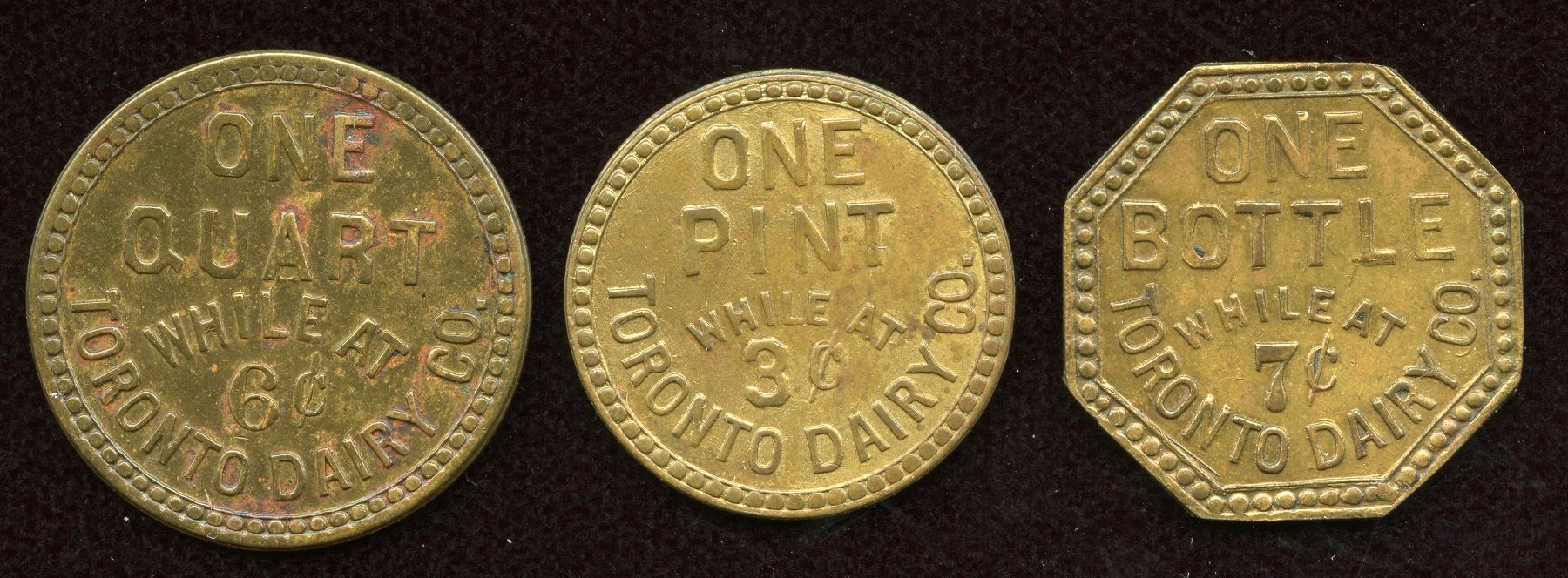 Br. 811, Toronto Dairy, One Quart, 6c, Brass, VF; Br. 812, Toronto Dairy, One Pint, 3c, Brass, VF; Br. 813, Toronto Dairy, One Bottle, 7c, Brass, EF. 3 Pcs.